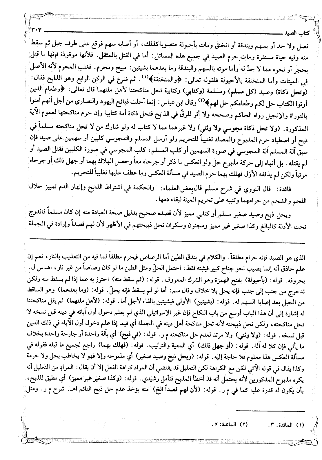 نَصْلٍ وَلَا حَدٍّ أَوْ بِسَهْمٍ وَبُنْدُقَةٍ أَوْ انْخَنَقَ وَمَاتَ بِأُحْبُولَةِ مَنْصُوبَةٍ كَذَلِكَ، أَوْ أَصَابَهُ سَهْمٌ فَوَقَعَ عَلَى طَرَفِ جَبَلٍ ثُمَّ سَقَطَ مِنْهُ وَفِيهِ حَيَاةٌ مُسْتَقِرَّةٌ وَمَاتَ حَرُمَ الصَّيْدُ فِي جَمِيعِ هَذِهِ الْمَسَائِلِ: أَمَّا فِي الْقَتْلِ بِالْمُثْقَلِ. فَلِأَنَّهَا مَوْقُوذَةٌ فَإِنَّهَا مَا قُتِلَ بِحَجَرٍ أَوْ نَحْوِهِ مِمَّا لَا حَدَّ لَهُ وَأَمَّا مَوْتُهُ بِالسَّهْمِ وَالْبُنْدُقَةِ وَمَا بَعْدَهُمَا بِشَيْئَيْنِ: مُبِيحٌ وَمُحَرَّمٌ. فَغَلَبَ الْمُحَرَّمُ لِأَنَّهُ الْأَصْلُ فِي الْمَيْتَاتِ وَأَمَّا الْمُنْخَنِقَةُ بِالْأُحْبُولَةِ فَلِقَوْلِهِ تَعَالَى: {وَالْمُنْخَنِقَةُ} [المائدة: 3] .