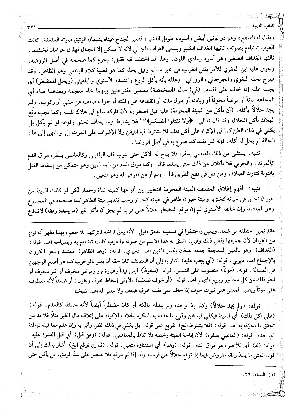 وَيُقَالُ لَهُ الْقُعْقُعُ، وَهُوَ ذُو لَوْنَيْنِ أَبْيَضُ وَأَسْوَدُ، طَوِيلُ الذَّنَبِ، قَصِيرُ الْجَنَاحِ عَيْنَاهُ يُشْبِهَانِ الزِّئْبَقَ صَوْتُهُ الْعَقْعَقَةُ. كَانَتْ الْعَرَبُ تَتَشَاءَمُ بِصَوْتِهِ، ثَانِيهَا الْغُدَافُ الْكَبِيرُ وَيُسَمَّى الْغُرَابَ الْجَبَلِيَّ لِأَنَّهُ لَا يَسْكُنُ إلَّا الْجِبَالَ فَهَذَانِ حَرَامَانِ لِخُبْثِهِمَا، ثَالِثُهَا الْغُدَافُ الصَّغِيرُ وَهُوَ أَسْوَدُ رَمَادِيُّ اللَّوْنِ. وَهَذَا قَدْ اُخْتُلِفَ فِيهِ فَقِيلَ: يَحْرُمُ كَمَا صَحَّحَهُ فِي أَصْلِ الرَّوْضَةِ، وَجَرَى عَلَيْهِ ابْنُ الْمُقْرِي لِلْأَمْرِ بِقَتْلِ الْغُرَابِ فِي خَبَرِ مُسْلِمٍ وَقِيلَ بِحِلِّهِ كَمَا هُوَ قَضِيَّةُ كَلَامِ الرَّافِعِيِّ وَهُوَ الظَّاهِرُ. وَقَدْ صَرَّحَ بِحِلِّهِ الْبَغَوِيّ وَالْجُرْجَانِيُّ وَالرُّويَانِيُّ. وَعَلَّلَهُ بِأَنَّهُ يَأْكُلُ الزَّرْعَ وَاعْتَمَدَهُ الْإِسْنَوِيُّ وَالْبُلْقِينِيُّ (وَيَحِلُّ لِلْمُضْطَرِّ) أَيْ يَجِبُ عَلَيْهِ إذَا خَافَ عَلَى نَفْسِهِ. (فِي) حَالِ (الْمَخْمَصَةِ) بِمِيمَيْنِ مَفْتُوحَتَيْنِ بَيْنَهُمَا خَاءٌ مُعْجَمَةٌ وَبَعْدَهُمَا صَادٌ أَيْ الْمَجَاعَةُ مَوْتًا أَوْ مَرَضًا مَخُوفًا زِيَادَتُهُ أَوْ طُولُ مُدَّتِهِ أَوْ انْقِطَاعَهُ عَنْ رُفْقَتِهِ أَوْ خَوْفَ ضَعْفٍ عَنْ مَشْيٍ أَوْ رُكُوبٍ. وَلَمْ يَجِدْ حَلَالًا يَأْكُلُهُ. (أَنْ يَأْكُلَ مِنْ الْمَيْتَةِ الْمُحَرَّمَةِ) عَلَيْهِ قَبْلَ اضْطِرَارِهِ لِأَنَّ تَارِكَهُ سَاعٍ فِي هَلَاكِ نَفْسِهِ وَكَمَا يَجِبُ دَفْعُ الْهَلَاكِ بِأَكْلِ الْحَلَالِ وَقَدْ قَالَ تَعَالَى: {وَلا تَقْتُلُوا أَنْفُسَكُمْ} [النساء: 29] فَلَا يُشْتَرَطُ فِيمَا يَخَافُ تَحَقُّقُ وُقُوعِهِ لَوْ لَمْ يَأْكُلْ بَلْ يَكْفِي فِي ذَلِكَ الظَّنُّ كَمَا فِي الْإِكْرَاهِ عَلَى أَكْلِ ذَلِكَ فَلَا يُشْتَرَطُ فِيهِ التَّيَقُّنُ وَلَا الْإِشْرَافُ عَلَى الْمَوْتِ بَلْ لَوْ انْتَهَى إلَى هَذِهِ الْحَالَةِ لَمْ يَحِلَّ لَهُ أَكْلُهُ، فَإِنَّهُ غَيْرُ مُفِيدٍ كَمَا صَرَّحَ بِهِ فِي أَصْلِ الرَّوْضَةِ.
