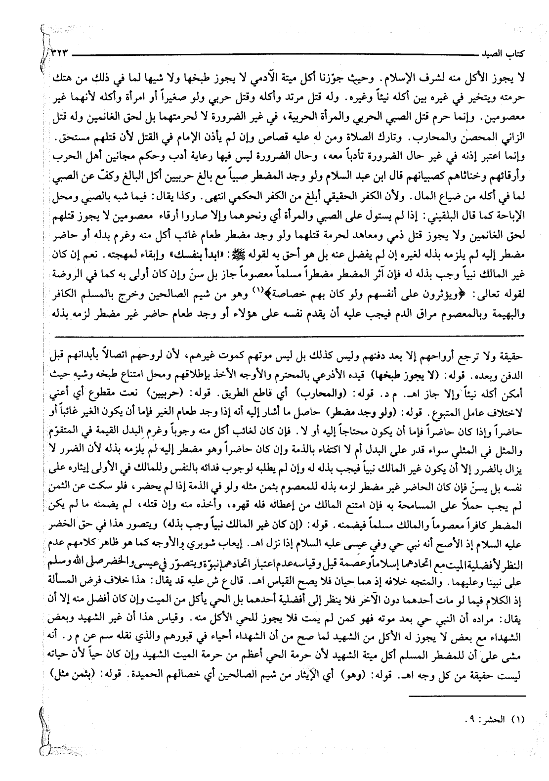 لَا يَجُوزُ الْأَكْلُ مِنْهُ لِشَرَفِ الْإِسْلَامِ. وَحَيْثُ جَوَّزْنَا أَكْلُ مَيْتَةِ الْآدَمِيِّ يَجُوزُ طَبْخُهَا وَلَا شَيُّهَا لِمَا فِي ذَلِكَ مِنْ هَتْكِ حُرْمَتِهِ وَيَتَخَيَّرُ فِي غَيْرِهِ بَيْنَ أَكْلِهِ نِيئًا وَغَيْرِهِ. وَلَهُ قَتْلُ مُرْتَدٍّ وَأَكْلُهُ وَقَتْلُ حَرْبِيٍّ وَلَوْ صَغِيرًا أَوْ امْرَأَةً وَأَكْلُهُ لِأَنَّهُمَا غَيْرُ مَعْصُومَيْنِ. وَإِنَّمَا حَرُمَ قَتْلُ الصَّبِيِّ الْحَرْبِيِّ وَالْمَرْأَةِ الْحَرْبِيَّةِ، فِي غَيْرِ الضَّرُورَةِ لَا لِحُرْمَتِهِمَا بَلْ لِحَقِّ الْغَانِمِينَ وَلَهُ قَتْلُ الزَّانِي الْمُحْصَنِ وَالْمُحَارِبِ. وَتَارِكِ الصَّلَاةِ وَمَنْ لَهُ عَلَيْهِ قِصَاصٌ وَإِنْ لَمْ يَأْذَنْ الْإِمَامُ فِي الْقَتْلِ لِأَنَّ قَتْلَهُمْ مُسْتَحَقٌّ.
