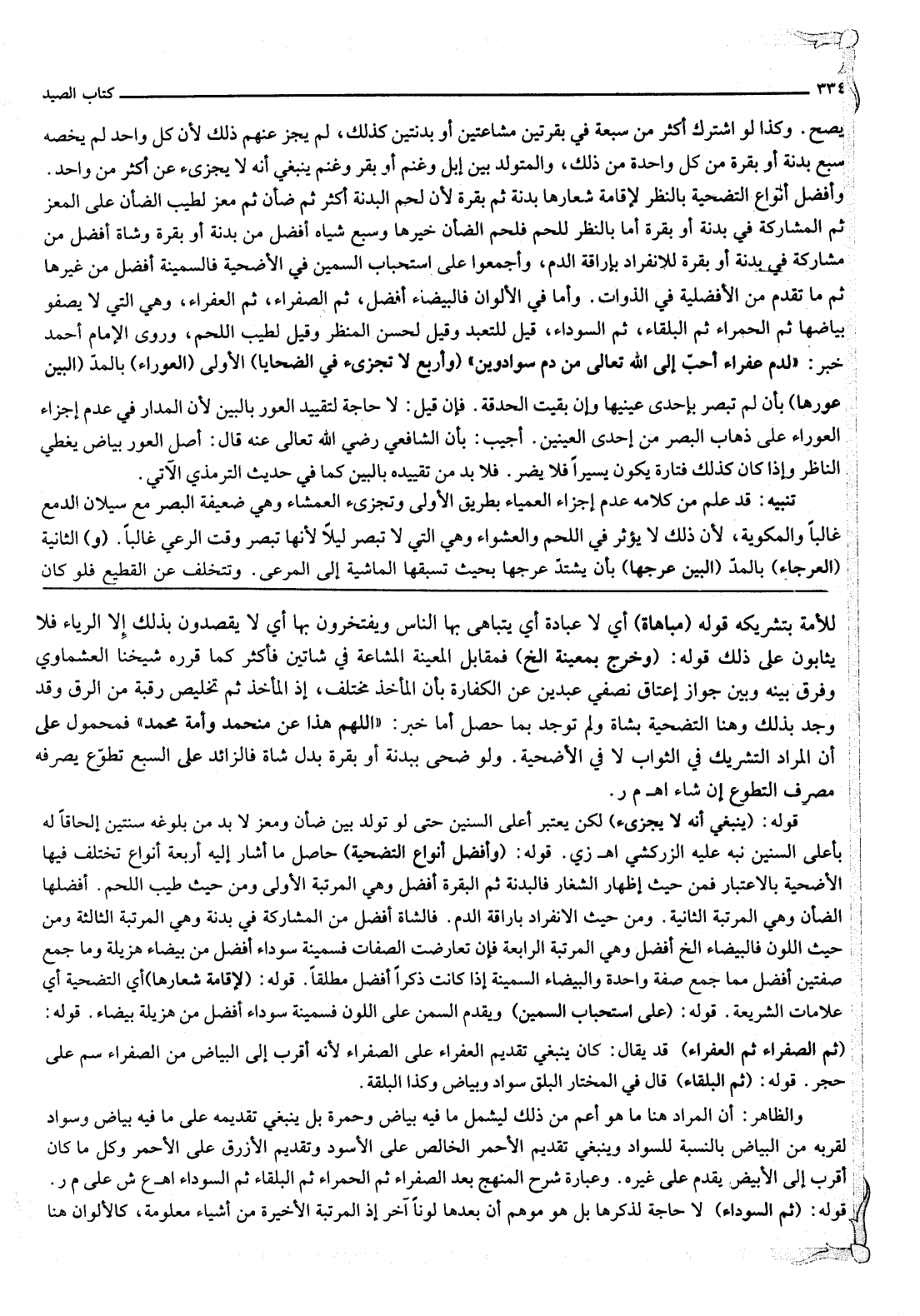 وَأَفْضَلُ أَنْوَاعِ التَّضْحِيَةِ بِالنَّظَرِ لِإِقَامَةِ شِعَارِهَا بَدَنَةٌ ثُمَّ بَقَرَةٌ لِأَنَّ لَحْمَ الْبَدَنَةِ أَكْثَرُ ثُمَّ ضَأْنٌ ثُمَّ مَعْزٌ لِطِيبِ الضَّأْنِ عَلَى الْمَعْزِ ثُمَّ الْمُشَارَكَةُ فِي بَدَنَةٍ أَوْ بَقَرَةٍ أَمَّا بِالنَّظَرِ لِلَّحْمِ فَلَحْمُ الضَّأْنِ خَيْرُهَا وَسَبْعُ شِيَاهٍ أَفْضَلُ مِنْ بَدَنَةٍ أَوْ بَقَرَةٍ وَشَاةٌ أَفْضَلُ مِنْ مُشَارَكَةٍ فِي بَدَنَةٍ أَوْ بَقَرَةٍ لِلِانْفِرَادِ بِإِرَاقَةِ الدَّمِ، وَأَجْمَعُوا عَلَى اسْتِحْبَابِ السَّمِينِ فِي الْأُضْحِيَّةِ فَالسَّمِينَةُ أَفْضَلُ مِنْ غَيْرِهَا ثُمَّ مَا تَقَدَّمَ مِنْ الْأَفْضَلِيَّةِ فِي الذَّوَاتِ. وَأَمَّا فِي الْأَلْوَانِ فَالْبَيْضَاءُ أَفْضَلُ، ثُمَّ الصَّفْرَاءُ، ثُمَّ الْعَفْرَاءُ وَهِيَ الَّتِي لَا يَصْفُو بَيَاضُهَا ثُمَّ الْحَمْرَاءُ ثُمَّ الْبَلْقَاءُ، ثُمَّ السَّوْدَاءُ، قِيلَ لِلتَّعَبُّدِ وَقِيلَ لِحُسْنِ الْمَنْظَرِ وَقِيلَ لِطِيبِ اللَّحْمِ، وَرَوَى الْإِمَامُ أَحْمَدُ خَبَرَ: «لَدَمُ عَفْرَاءَ أَحَبُّ إلَى اللَّهِ تَعَالَى مِنْ دَمِ سَوْدَاوَيْنِ»