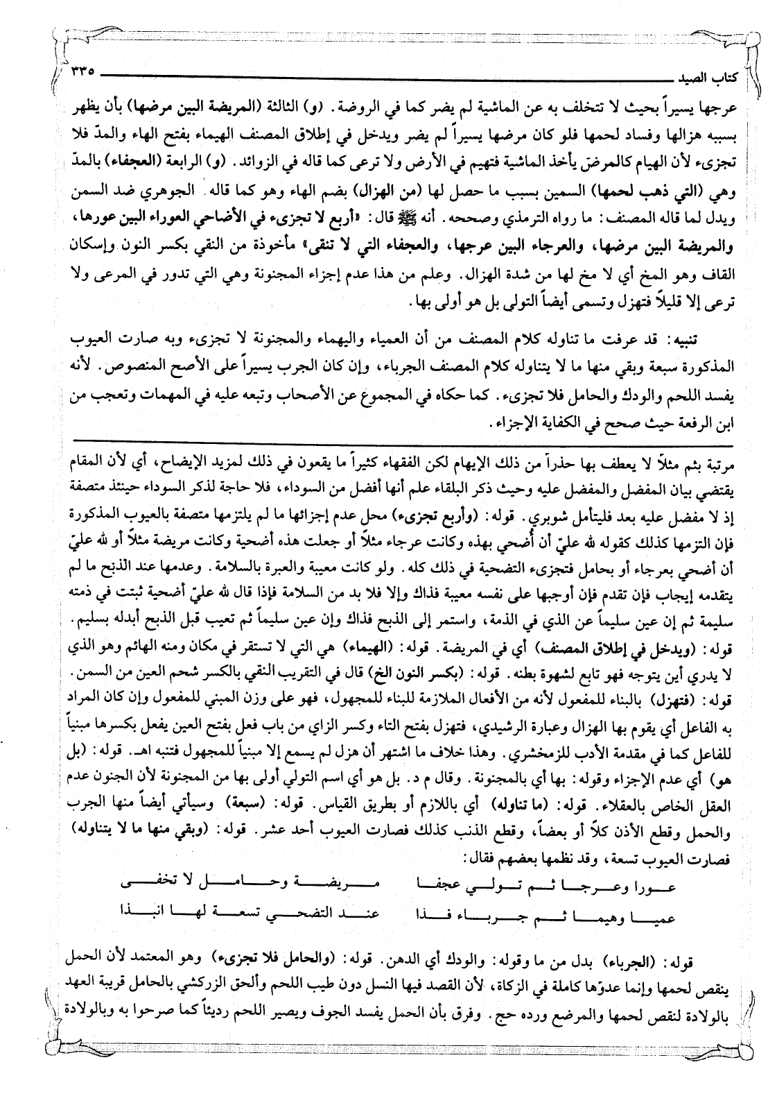 قَوْلُهُ: (وَأَرْبَعٌ لَا تُجْزِئُ) مَحَلُّ عَدَمِ إجْزَائِهَا مَا لَمْ يَلْتَزِمْهَا مُتَّصِفَةً بِالْعُيُوبِ الْمَذْكُورَةِ فَإِنْ الْتَزَمَهَا كَذَلِكَ كَقَوْلِهِ لِلَّهِ عَلَيَّ أَنْ أُضَحِّيَ بِهَذِهِ وَكَانَتْ عَرْجَاءَ مَثَلًا أَوْ جَعَلْت هَذِهِ أُضْحِيَّةً وَكَانَتْ مَرِيضَةً مَثَلًا أَوْ لِلَّهِ عَلَيَّ أَنْ أُضَحِّيَ بِعَرْجَاءَ أَوْ بِحَامِلٍ فَتُجْزِئُ التَّضْحِيَةُ فِي ذَلِكَ كُلِّهِ. وَلَوْ كَانَتْ مَعِيبَةً وَالْعِبْرَةُ بِالسَّلَامَةِ. وَعَدَمِهَا عِنْدَ الذَّبْحِ مَا لَمْ يَتَقَدَّمْهُ إيجَابٌ فَإِنْ تَقَدَّمَ فَإِنْ أَوْجَبَهَا عَلَى نَفْسِهِ مَعِيبَةً فَذَاكَ وَإِلَّا فَلَا بُدَّ مِنْ السَّلَامَةِ فَإِذَا قَالَ لِلَّهِ عَلَيَّ أُضْحِيَّةٌ ثَبَتَتْ فِي ذِمَّتِهِ سَلِيمَةً ثُمَّ إنْ عَيَّنَ سَلِيمًا عَنْ الَّذِي فِي الذِّمَّةِ، وَاسْتَمَرَّ إلَى الذَّبْحِ فَذَاكَ وَإِنْ عَيَّنَ سَلِيمًا ثُمَّ تَعَيَّبَ قَبْلَ الذَّبْحِ أَبْدَلَهُ بِسَلِيمٍ.