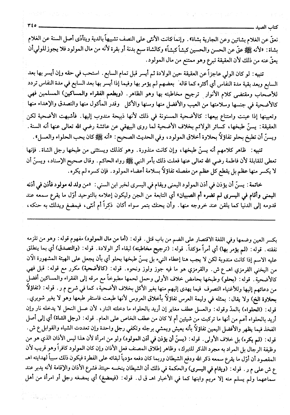 خَاتِمَةٌ: يُسَنُّ أَنْ يُؤَذَّنَ فِي أُذُنِ الْمَوْلُودِ الْيُمْنَى وَيُقَامَ فِي الْيُسْرَى لِخَبَرِ ابْنِ السِّنِيِّ: «مَنْ وُلِدَ لَهُ مَوْلُودٌ فَأَذَّنَ فِي أُذُنِهِ الْيُمْنَى وَأَقَامَ فِي الْيُسْرَى لَمْ تَضُرَّهُ أُمُّ الصِّبْيَانِ» أَيْ التَّابِعَةُ مِنْ الْجِنِّ وَلِيَكُونَ إعْلَامُهُ بِالتَّوْحِيدِ أَوَّلُ مَا يَقْرَعُ سَمْعَهُ عِنْدَ قُدُومِهِ إلَى الدُّنْيَا كَمَا يُلَقَّنُ عِنْدَ خُرُوجِهِ مِنْهَا. وَأَنْ يُحَنَّكَ بِتَمْرٍ سَوَاءٌ أَكَانَ ذَكَرًا أَمْ أُنْثَى، فَيُمْضَغُ وَيُدَلَّكُ بِهِ حَنَكُهُ،