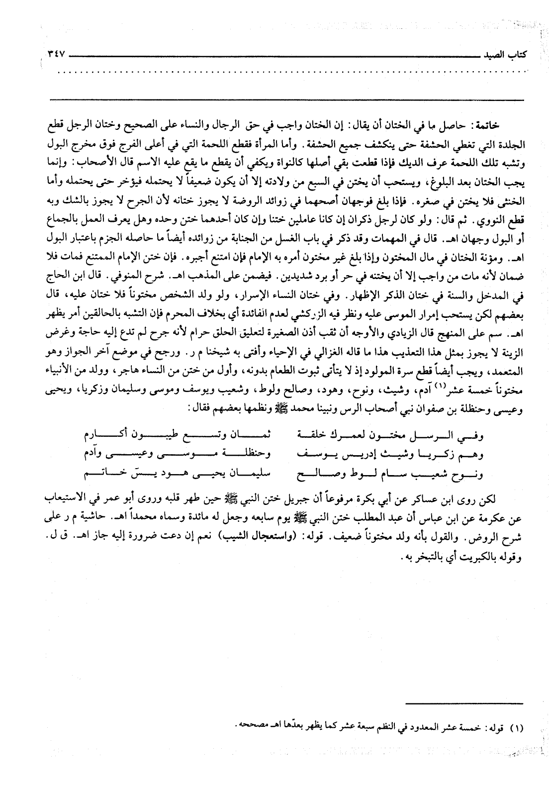وَأَوَّلُ مَنْ خُتِنَ مِنْ النِّسَاءِ هَاجَرُ، وَوُلِدَ مِنْ الْأَنْبِيَاءِ مَخْتُونًا خَمْسَةَ عَشَرَ آدَم، وَشِيثُ وَنُوحٌ، وَهُودٌ، وَصَالِحٌ وَلُوطٌ، وَشُعَيْبٌ وَيُوسُفُ وَمُوسَى وَسُلَيْمَانُ وَزَكَرِيَّا، وَيَحْيَى وَعِيسَى وَحَنْظَلَةُ بْنُ صَفْوَانَ نَبِيُّ أَصْحَابِ الرَّسِّ وَنَبِيُّنَا مُحَمَّدٌ - صَلَّى اللَّهُ عَلَيْهِ وَسَلَّمَ - وَنَظَمَهَا بَعْضُهُمْ فَقَالَ: