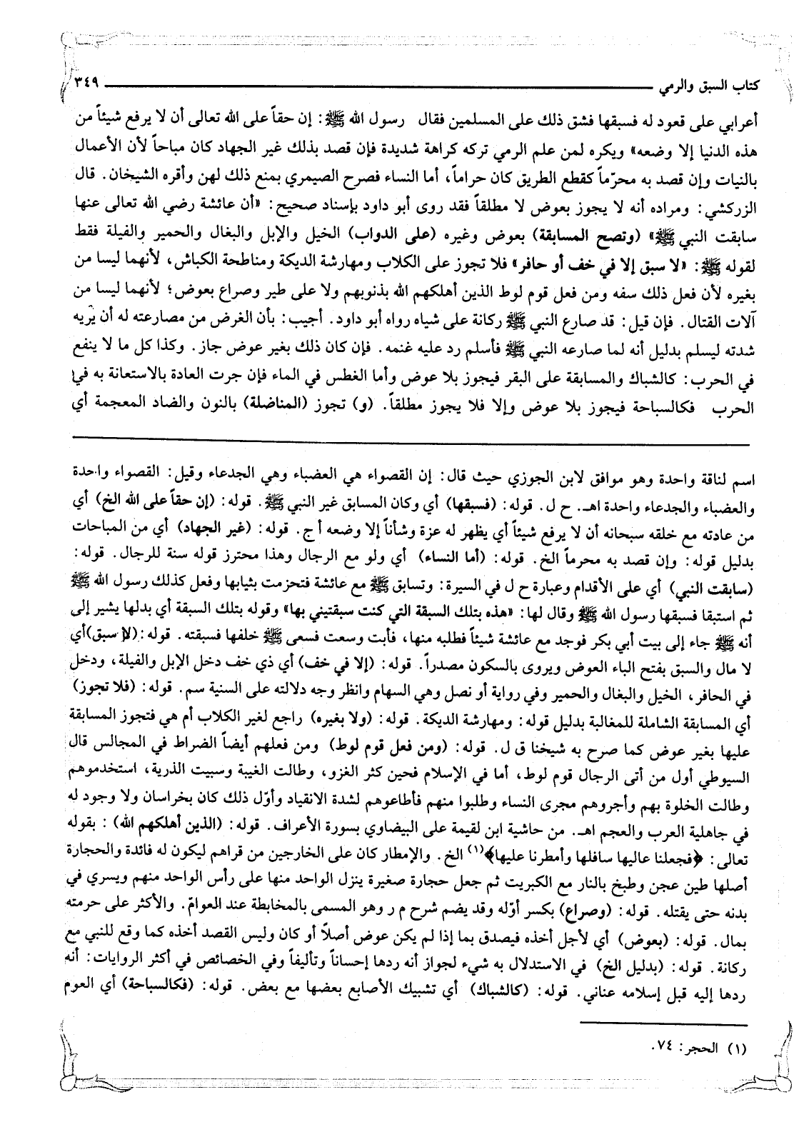 أَعْرَابِيٌّ عَلَى قَعُودٍ لَهُ فَسَبَقَهَا فَشَقَّ ذَلِكَ عَلَى الْمُسْلِمِينَ فَقَالَ رَسُولُ اللَّهِ - صَلَّى اللَّهُ عَلَيْهِ وَسَلَّمَ -: إنْ حَقًّا عَلَى اللَّهِ تَعَالَى أَنْ لَا يَرْفَعَ شَيْئًا مِنْ هَذِهِ الدُّنْيَا إلَّا وَضَعَهُ» وَيُكْرَهُ لِمَنْ عَلِمَ الرَّمْيَ تَرْكُهُ كَرَاهَةً شَدِيدَةً فَإِنْ قَصَدَ بِذَلِكَ غَيْرَ الْجِهَادِ كَانَ مُبَاحًا لِأَنَّ الْأَعْمَالَ بِالنِّيَّاتِ وَإِنْ قَصَدَ بِهِ مُحَرَّمًا كَقَطْعِ الطَّرِيقِ كَانَ حَرَامًا، أَمَّا النِّسَاءُ فَصَرَّحَ الصَّيْمَرِيُّ بِمَنْعِ ذَلِكَ لَهُنَّ وَأَقَرَّهُ الشَّيْخَانِ. قَالَ الزَّرْكَشِيّ: وَمُرَادُهُ أَنَّهُ لَا يَجُوزُ بِعِوَضٍ لَا مُطْلَقًا فَقَدْ رَوَى أَبُو دَاوُد بِإِسْنَادٍ صَحِيحٍ: «أَنَّ عَائِشَةَ - رَضِيَ اللَّهُ تَعَالَى عَنْهَا - سَابَقَتْ النَّبِيَّ - صَلَّى اللَّهُ عَلَيْهِ وَسَلَّمَ -»