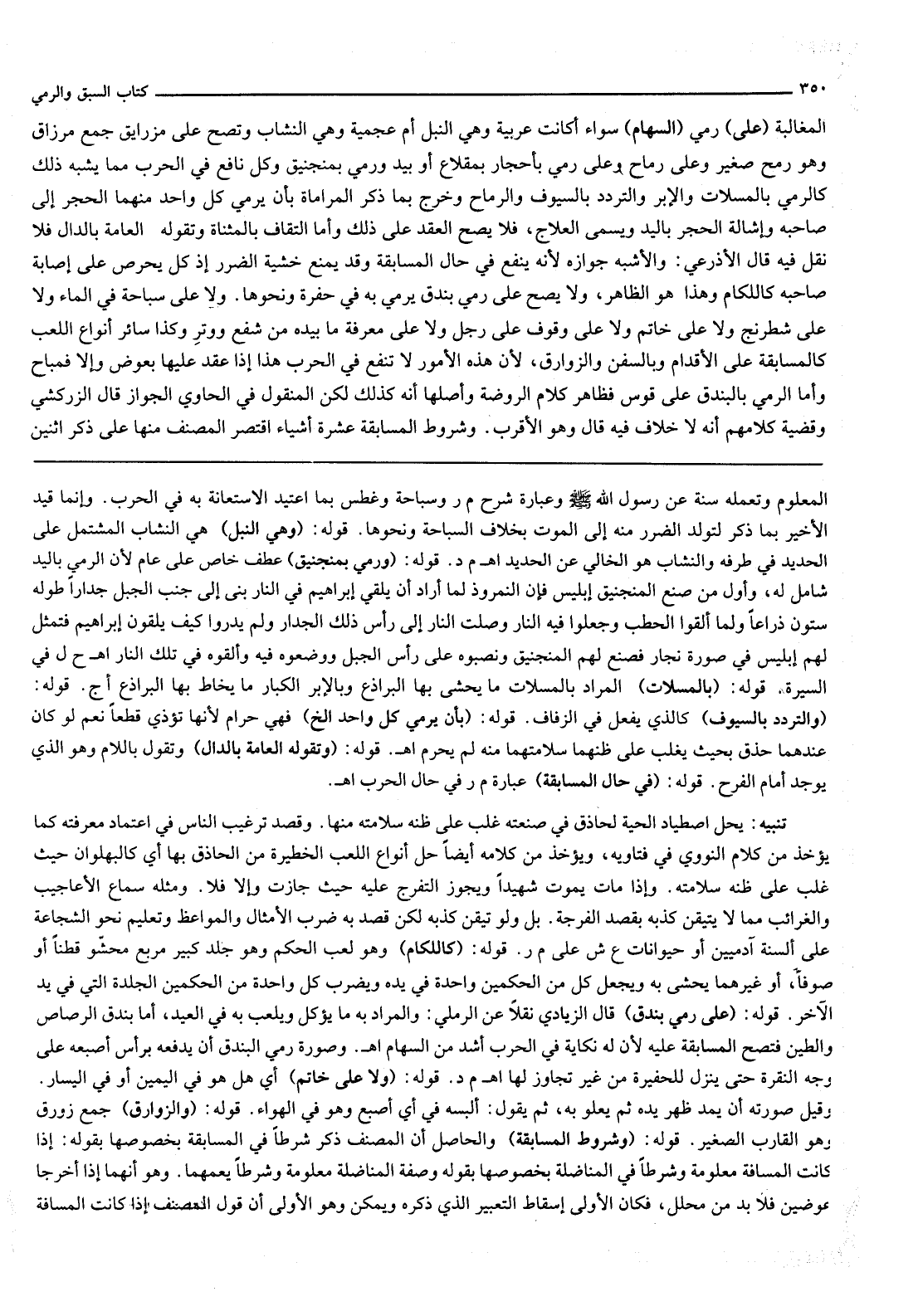 الْمُغَالَبَةُ عَلَى رَمْيِ السِّهَامِ سَوَاءٌ كَانَتْ عَرَبِيَّةً وَهِيَ النَّبْلُ أَمْ عَجَمِيَّةً وَهِيَ النُّشَّابُ وَتَصِحُّ عَلَى مَزَارِيق جَمْعُ مِرْزَاقٍ وَهُوَ رُمْحٌ صَغِيرٌ وَعَلَى رِمَاحٍ وَعَلَى رَمْيٍ بِأَحْجَارٍ بِمِقْلَاعٍ أَوْ بِيَدٍ وَرَمْيٍ بِمَنْجَنِيقٍ وَكُلٌّ نَافِعٌ فِي الْحَرْبِ مِمَّا يُشْبِهُ ذَلِكَ كَالرَّمْيِ بِالْمِسَلَّاتِ وَالْإِبَرِ وَالتَّرَدُّدِ بِالسُّيُوفِ وَالرِّمَاحِ وَخَرَجَ بِمَا ذُكِرَ الْمُرَامَاةُ بِأَنْ يَرْمِيَ كُلُّ وَاحِدٍ مِنْهُمَا الْحَجَرَ إلَى صَاحِبِهِ وَإِشَالَةُ الْحَجَرِ بِالْيَدِ وَيُسَمَّى الْعِلَاجُ، فَلَا يَصِحُّ الْعَقْدُ عَلَى ذَلِكَ وَأَمَّا الْتِقَافُ بِالْمُثَنَّاةِ وَتَقُولُهُ الْعَامَّةُ بِالدَّالِ فَلَا نَقْلَ فِيهِ قَالَ الْأَذْرَعِيُّ: وَالْأَشْبَهُ جَوَازُهُ لِأَنَّهُ يَنْفَعُ فِي حَالِ الْمُسَابَقَةِ وَقَدْ يُمْنَعُ خَشْيَةَ الضَّرَرِ إذْ كُلٌّ يَحْرِصُ عَلَى إصَابَةِ صَاحِبِهِ كَاللِّكَامِ وَهَذَا هُوَ الظَّاهِرُ، وَلَا يَصِحُّ عَلَى رَمْيِ بُنْدُقٍ يُرْمَى بِهِ فِي حُفْرَةٍ وَنَحْوِهَا. وَلَا عَلَى سِبَاحَةٍ فِي الْمَاءِ وَلَا عَلَى شِطْرَنْجٍ وَلَا عَلَى خَاتَمٍ وَلَا عَلَى وُقُوفٍ عَلَى رِجْلٍ وَلَا عَلَى مَعْرِفَةِ مَا بِيَدِهِ مِنْ شَفْعٍ وَوِتْرٍ وَكَذَا سَائِرُ أَنْوَاعِ اللَّعِبِ كَالْمُسَابَقَةِ عَلَى الْأَقْدَامِ وَبِالسُّفُنِ وَالزَّوَارِقِ، لِأَنَّ هَذِهِ الْأُمُورَ لَا تَنْفَعُ فِي الْحَرْبِ هَذَا إذَا عُقِدَ عَلَيْهَا بِعِوَضٍ وَإِلَّا فَمُبَاحٌ وَأَمَّا الرَّمْيُ بِالْبُنْدُقِ عَلَى قَوْسٍ فَظَاهِرُ كَلَامِ الرَّوْضَةِ وَأَصْلُهَا أَنَّهُ كَذَلِكَ لَكِنَّ الْمَنْقُولَ فِي الْحَاوِي الْجَوَازُ قَالَ الزَّرْكَشِيّ وَقَضِيَّةُ كَلَامِهِمْ أَنَّهُ لَا خِلَافَ فِيهِ قَالَ وَهُوَ الْأَقْرَبُ.