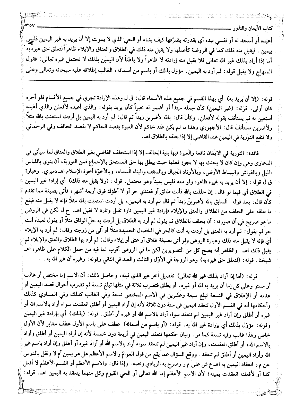 أَعْبُدُهُ أَوْ أَسْجُدُ لَهُ أَوْ نَفْسِي بِيَدِهِ أَيْ بِقُدْرَتِهِ يُصَرِّفُهَا كَيْفَ يَشَاءُ أَوْ الْحَيُّ الَّذِي لَا يَمُوتُ إلَّا أَنْ يُرِيدَ بِهِ غَيْرَ الْيَمِينِ فَلَيْسَ بِيَمِينٍ. فَيُقْبَلُ مِنْهُ ذَلِكَ كَمَا فِي الرَّوْضَةِ كَأَصْلِهَا وَلَا يُقْبَلُ مِنْهُ ذَلِكَ فِي الطَّلَاقِ وَالْعَتَاقِ وَالْإِيلَاءِ ظَاهِرًا لِتَعَلُّقِ حَقِّ غَيْرِهِ بِهِ أَمَّا إذَا أَرَادَ بِذَلِكَ غَيْرَ اللَّهِ تَعَالَى فَلَا يُقْبَلُ مِنْهُ إرَادَتُهُ لَا ظَاهِرًا وَلَا بَاطِنًا لِأَنَّ الْيَمِينَ بِذَلِكَ لَا تَحْتَمِلُ غَيْرَهُ تَعَالَى: فَقَوْلُ الْمِنْهَاجِ وَلَا يُقْبَلُ قَوْلُهُ: لَمْ أُرِدْ بِهِ الْيَمِينَ. مُؤَوَّلٌ بِذَلِكَ أَوْ بِاسْمٍ مِنْ أَسْمَائِهِ، الْغَالِبِ إطْلَاقُهُ عَلَيْهِ سُبْحَانَهُ وَتَعَالَى وَعَلَى