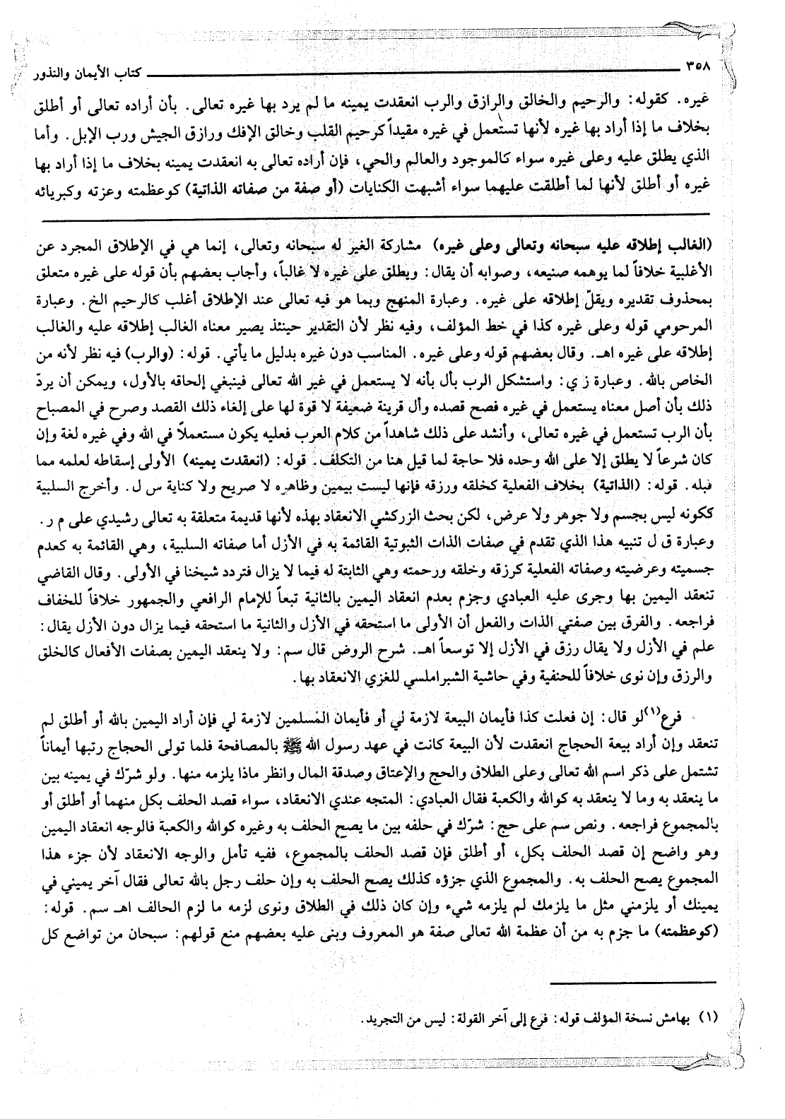 غَيْرِهِ. كَقَوْلِهِ: وَالرَّحِيمِ وَالْخَالِقِ وَالرَّازِقِ وَالرَّبِّ انْعَقَدَتْ يَمِينُهُ مَا لَمْ يُرِدْ بِهَا غَيْرَهُ تَعَالَى. بِأَنْ أَرَادَهُ تَعَالَى أَوْ أَطْلَقَ بِخِلَافِ مَا إذَا أَرَادَ بِهَا غَيْرَهُ لِأَنَّهَا تُسْتَعْمَلُ فِي غَيْرِهِ مُقَيَّدًا كَرَحِيمِ الْقَلْبِ وَخَالِقِ الْإِفْكِ وَرَازِقِ الْجَيْشِ وَرَبِّ الْإِبِلِ. وَأَمَّا الَّذِي يُطْلَقُ عَلَيْهِ وَعَلَى غَيْرِهِ سَوَاءٌ كَالْمَوْجُودِ وَالْعَالِمِ وَالْحَيِّ، فَإِنْ أَرَادَهُ تَعَالَى بِهِ انْعَقَدَتْ يَمِينُهُ بِخِلَافِ مَا إذَا أَرَادَ بِهَا غَيْرَهُ أَوْ أَطْلَقَ لِأَنَّهَا لَمَّا أُطْلِقَتْ عَلَيْهِمَا سَوَاءٌ أَشْبَهَتْ الْكِنَايَاتِ (أَوْ صِفَةٌ مِنْ صِفَاتِهِ الذَّاتِيَّةِ) كَوَعَظَمَتِهِ وَعِزَّتِهِ وَكِبْرِيَائِهِ