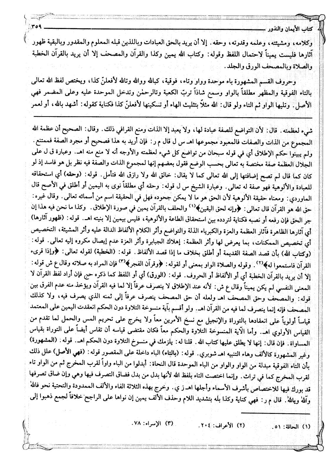 وَكَلَامِهِ، وَمَشِيئَتِهِ، وَعِلْمِهِ وَقُدْرَتِهِ، وَحَقِّهِ. إلَّا أَنْ يُرِيدَ بِالْحَقِّ الْعِبَادَاتِ وَبِاَللَّذَيْنِ قَبْلَهُ الْمَعْلُومَ وَالْمَقْدُورَ وَبِالْبَقِيَّةِ ظُهُورَ آثَارِهَا فَلَيْسَتْ يَمِينًا لِاحْتِمَالِ اللَّفْظِ وَقَوْلُهُ: وَكِتَابِ اللَّهِ يَمِينٌ وَكَذَا وَالْقُرْآنِ وَالْمُصْحَفِ إلَّا أَنْ يُرِيدَ بِالْقُرْآنِ الْخُطْبَةَ وَالصَّلَاةَ وَبِالْمُصْحَفِ الْوَرَقَ وَالْجِلْدَ.