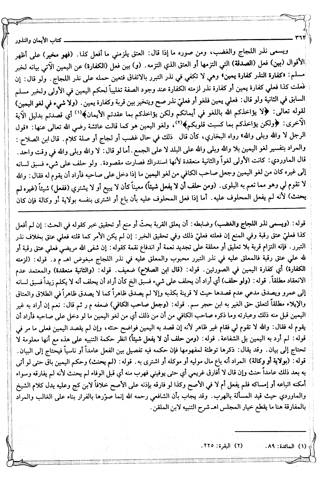 وَيُسَمَّى نَذْرُ اللَّجَاجِ وَالْغَضَبِ، وَمِنْ صُوَرِهِ مَا إذَا قَالَ: الْعِتْقُ يَلْزَمُنِي مَا أَفْعَلُ كَذَا. (فَهُوَ مُخَيَّرٌ) عَلَى أَظْهَرْ الْأَقْوَالِ (بَيْنَ) فِعْلِ (الصَّدَقَةِ) الَّتِي الْتَزَمَهَا أَوْ الْعِتْقِ الَّذِي الْتَزَمَهُ. (وَ) بَيْنَ فِعْلِ (الْكَفَّارَةِ) عَنْ الْيَمِينِ الْآتِي بَيَانُهُ لِخَبَرِ مُسْلِمٍ: «كَفَّارَةُ النَّذْرِ كَفَّارَةُ يَمِينٍ» وَهِيَ لَا تَكْفِي فِي نَذْرِ التَّبَرُّرِ بِالِاتِّفَاقِ فَتَعَيَّنَ حَمْلُهُ عَلَى نَذْرِ اللَّجَاجِ. وَلَوْ قَالَ: إنْ فَعَلْت كَذَا فَعَلَيَّ كَفَّارَةُ يَمِينٍ أَوْ كَفَّارَةُ نَذْرٍ لَزِمَتْهُ الْكَفَّارَةُ عِنْدَ وُجُودِ الصِّفَةِ تَغْلِيبًا لِحُكْمِ الْيَمِينِ فِي الْأُولَى وَلِخَبَرِ مُسْلِمٍ السَّابِقِ فِي الثَّانِيَةِ وَلَوْ قَالَ: فَعَلَيَّ يَمِينٌ فَلَغْوٌ أَوْ فَعَلَيَّ نَذْرٌ صَحَّ وَيَتَخَيَّرُ بَيْنَ قُرْبَةٍ وَكَفَّارَةِ يَمِينٍ.