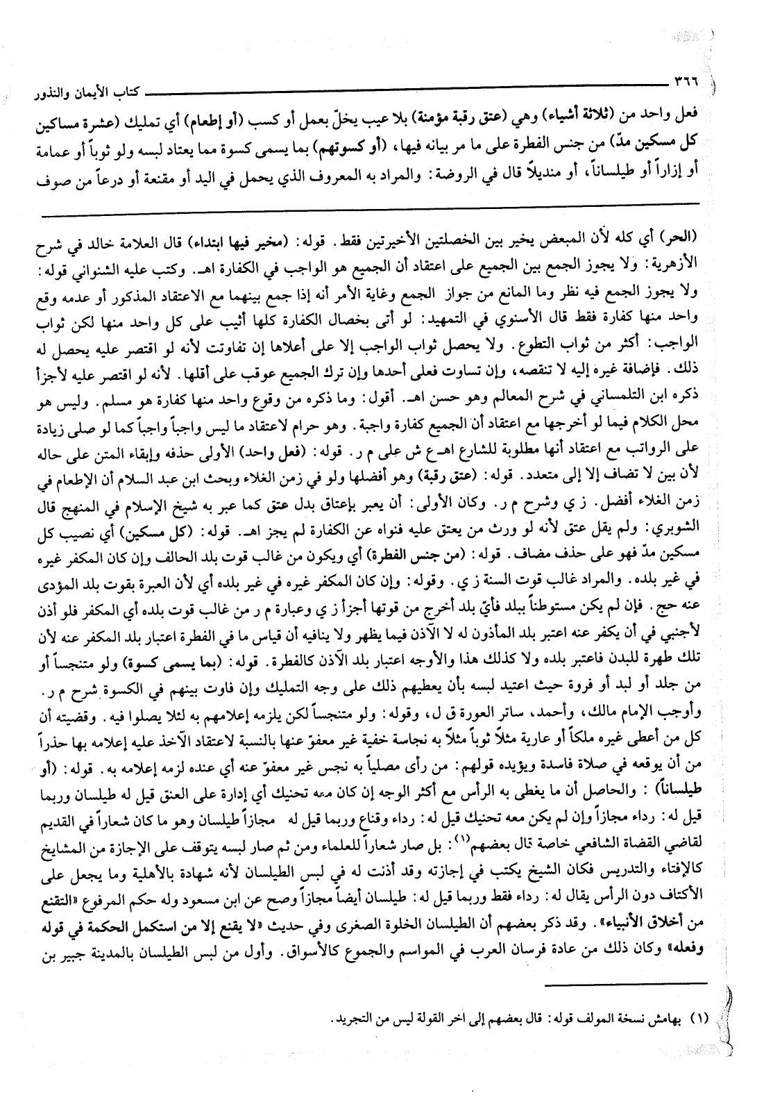 فِعْلٍ وَاحِدٍ مِنْ (ثَلَاثَةِ أَشْيَاءَ) وَهِيَ (عِتْقُ رَقَبَةٍ مُؤْمِنَةٍ) بِلَا عَيْبٍ يُخِلُّ بِعَمَلٍ أَوْ كَسْبٍ (أَوْ إطْعَامٍ) أَيْ تَمْلِيكٍ (عَشَرَةَ مَسَاكِينَ كُلُّ مِسْكِينٍ مُدٌّ) مِنْ جِنْسِ الْفِطْرَةِ عَلَى مَا مَرَّ بَيَانُهُ فِيهَا، (أَوْ كِسْوَتُهُمْ) بِمَا يُسَمَّى كِسْوَةً مِمَّا يُعْتَادُ لُبْسُهُ وَلَوْ ثَوْبًا أَوْ عِمَامَةً أَوْ إزَارًا أَوْ طَيْلَسَانًا، أَوْ مِنْدِيلًا قَالَ فِي الرَّوْضَةِ: وَالْمُرَادُ بِهِ الْمَعْرُوفُ الَّذِي يُحْمَلُ فِي الْيَدِ أَوْ مِقْنَعَةً أَوْ دِرْعًا مِنْ صُوفٍ
