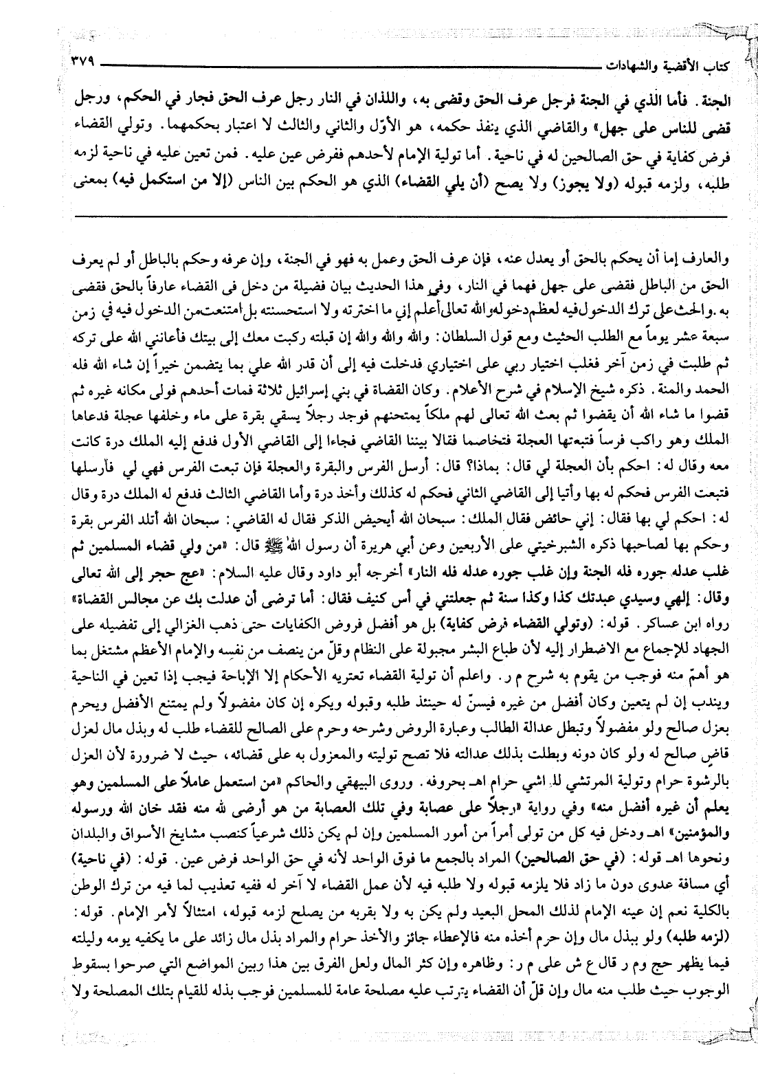 الْجَنَّةِ. فَأَمَّا الَّذِي فِي الْجَنَّةِ فَرَجُلٌ عَرَفَ الْحَقَّ وَقَضَى بِهِ، وَاَللَّذَانِ فِي النَّارِ رَجُلٌ عَرَفَ الْحَقَّ فَجَارَ فِي الْحُكْمِ، وَرَجُلٌ قَضَى لِلنَّاسِ عَلَى جَهْلٍ» وَالْقَاضِي الَّذِي يَنْفُذُ حُكْمُهُ، هُوَ الْأَوَّلُ وَالثَّانِي وَالثَّالِثُ لَا اعْتِبَارَ بِحُكْمِهِمَا. وَتَوَلِّي الْقَضَاءِ فَرْضُ كِفَايَةٍ فِي حَقِّ الصَّالِحِينَ لَهُ فِي نَاحِيَةٍ. أَمَّا تَوْلِيَةُ الْإِمَامِ لِأَحَدِهِمْ فَفَرْضُ عَيْنٍ عَلَيْهِ. فَمَنْ تَعَيَّنَ عَلَيْهِ فِي نَاحِيَةٍ لَزِمَهُ طَلَبُهُ، وَلَزِمَهُ قَبُولُهُ