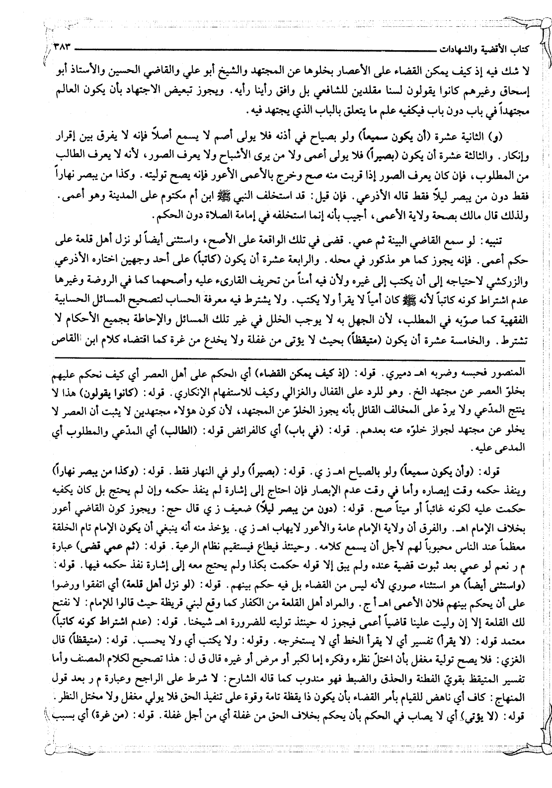 (وَ) الثَّانِيَةَ عَشْرَةَ (أَنْ يَكُونَ سَمِيعًا) وَلَوْ بِصِيَاحٍ فِي أُذُنِهِ فَلَا يُوَلَّى أَصَمُّ لَا يَسْمَعُ أَصْلًا فَإِنَّهُ لَا يُفَرِّقُ بَيْنَ إقْرَارٍ وَإِنْكَارٍ. وَالثَّالِثَةَ عَشْرَةَ أَنْ يَكُونَ (بَصِيرًا) فَلَا يُوَلَّى أَعْمَى وَلَا مَنْ يَرَى الْأَشْبَاحَ وَلَا يَعْرِفَ الصُّوَرَ، لِأَنَّهُ لَا يَعْرِفُ الطَّالِبَ مِنْ الْمَطْلُوبِ، فَإِنْ كَانَ يَعْرِفُ الصُّوَرَ إذَا قَرُبَتْ مِنْهُ صَحَّ وَخَرَجَ بِالْأَعْمَى الْأَعْوَرُ فَإِنَّهُ يَصِحُّ تَوْلِيَتُهُ. وَكَذَا مَنْ يُبْصِرُ نَهَارًا فَقَطْ دُونَ مَنْ يُبْصِرُ لَيْلًا فَقَطْ قَالَهُ الْأَذْرَعِيُّ.