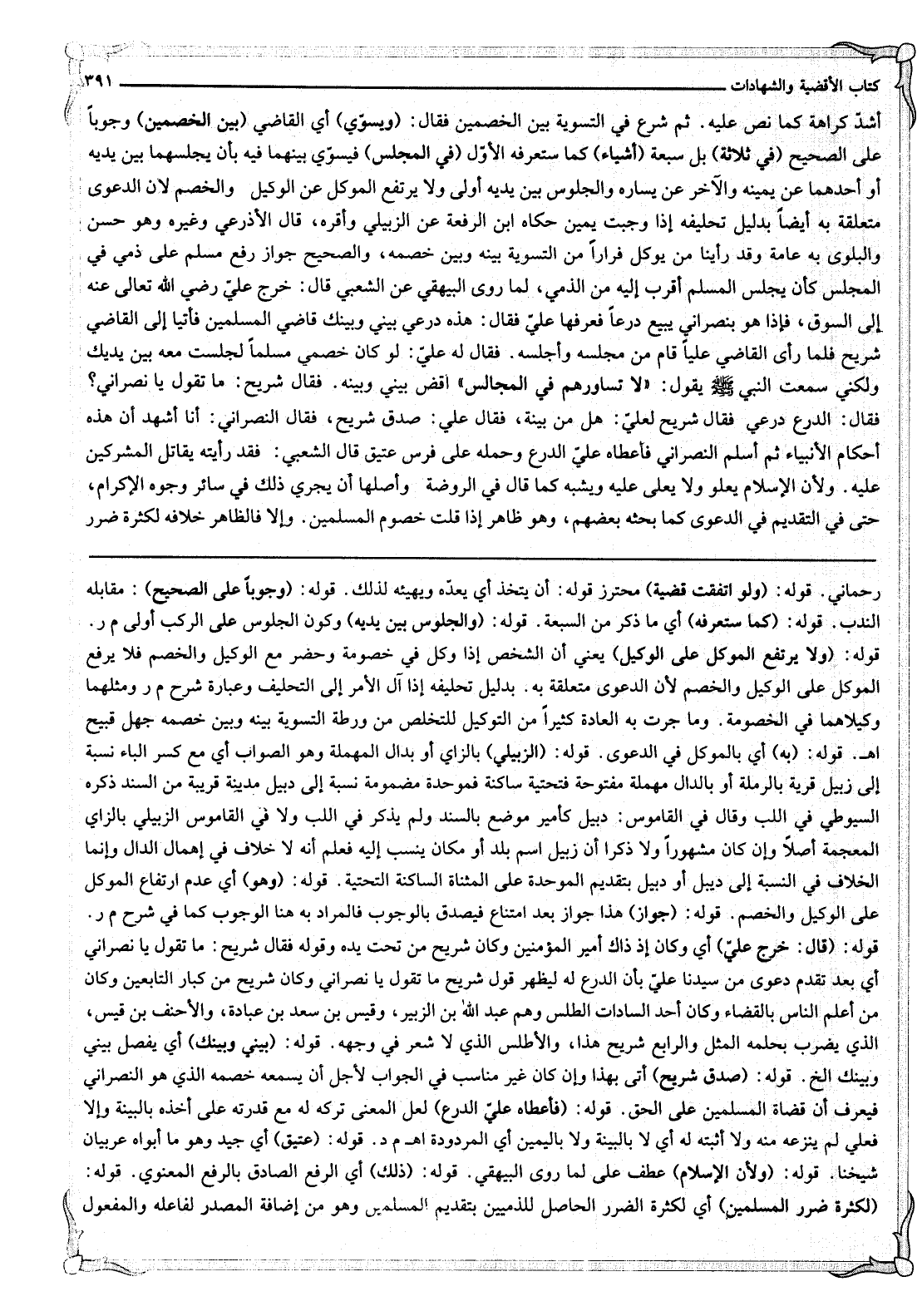 ثُمَّ شَرَعَ فِي التَّسْوِيَةِ بَيْنَ الْخَصْمَيْنِ فَقَالَ: (وَيُسَوِّي) أَيْ الْقَاضِي (بَيْنَ الْخَصْمَيْنِ) وُجُوبًا عَلَى الصَّحِيحِ (فِي ثَلَاثَةٍ) بَلْ سَبْعَةِ (أَشْيَاءَ) كَمَا سَتَعْرِفُهُ الْأَوَّلُ (فِي الْمَجْلِسِ) فَيُسَوِّي بَيْنَهُمَا فِيهِ بِأَنْ يُجْلِسَهُمَا بَيْنَ يَدَيْهِ أَوْ أَحَدَهُمَا عَنْ يَمِينِهِ وَالْآخَرَ عَنْ يَسَارِهِ وَالْجُلُوسُ بَيْنَ يَدَيْهِ أَوْلَى وَلَا يَرْتَفِعُ الْمُوَكِّلُ عَنْ الْوَكِيلِ وَالْخَصْمِ لِأَنَّ الدَّعْوَى مُتَعَلِّقَةٌ بِهِ أَيْضًا بِدَلِيلِ تَحْلِيفِهِ إذَا وَجَبَتْ يَمِينٌ حَكَاهُ ابْنُ الرِّفْعَةِ عَنْ الزَّبِيلِيِّ وَأَقَرَّهُ، قَالَ الْأَذْرَعِيُّ وَغَيْرُهُ وَهُوَ حَسَنٌ وَالْبَلْوَى بِهِ عَامَّةٌ وَقَدْ رَأَيْنَا مَنْ يُوَكِّلُ فِرَارًا مِنْ التَّسْوِيَةِ بَيْنَهُ وَبَيْنَ خَصْمِهِ، وَالصَّحِيحُ جَوَازُ رَفْعِ مُسْلِمٍ عَلَى ذِمِّيٍّ فِي الْمَجْلِسِ كَأَنْ يَجْلِسَ الْمُسْلِمُ أَقْرَبَ إلَيْهِ مِنْ الذِّمِّيِّ، لِمَا رَوَى الْبَيْهَقِيُّ عَنْ الشَّعْبِيِّ قَالَ: خَرَجَ عَلِيٌّ - رَضِيَ اللَّهُ تَعَالَى عَنْهُ - إلَى السُّوقِ، فَإِذَا هُوَ بِنَصْرَانِيٍّ يَبِيعُ دِرْعًا فَعَرَفَهَا عَلِيٌّ فَقَالَ: هَذِهِ دِرْعِي بَيْنِي وَبَيْنَك قَاضِي الْمُسْلِمِينَ فَأَتَيَا إلَى الْقَاضِي شُرَيْحٍ فَلَمَّا رَأَى الْقَاضِي عَلِيًّا قَامَ مِنْ مَجْلِسِهِ وَأَجْلَسَهُ. فَقَالَ لَهُ عَلِيٌّ: لَوْ كَانَ خَصْمِي مُسْلِمًا لَجَلَسْت مَعَهُ بَيْنَ يَدَيْك وَلَكِنِّي سَمِعْت النَّبِيَّ - صَلَّى اللَّهُ عَلَيْهِ وَسَلَّمَ - يَقُولُ: «لَا تُسَاوُوهُمْ فِي الْمَجَالِسِ» اقْضِ بَيْنِي وَبَيْنَهُ. فَقَالَ شُرَيْحٌ: مَا تَقُولُ يَا نَصْرَانِيُّ؟ فَقَالَ: الدِّرْعُ دِرْعِي فَقَالَ شُرَيْحٌ لِعَلِيٍّ: هَلْ مِنْ بَيِّنَةٍ، فَقَالَ عَلِيٌّ: صَدَقَ شُرَيْحٌ، فَقَالَ النَّصْرَانِيُّ: أَنَا أَشْهَدُ أَنَّ هَذِهِ أَحْكَامُ الْأَنْبِيَاءِ ثُمَّ أَسْلَمَ النَّصْرَانِيُّ فَأَعْطَاهُ عَلِيٌّ الدِّرْعَ وَحَمَلَهُ عَلَى فَرَسٍ عَتِيقٍ قَالَ الشَّعْبِيُّ: فَقَدْ رَأَيْته يُقَاتِلُ الْمُشْرِكِينَ عَلَيْهِ. وَلِأَنَّ الْإِسْلَامَ يَعْلُو وَلَا يُعْلَى عَلَيْهِ وَيُشْبِهُ كَمَا قَالَ فِي الرَّوْضَةِ وَأَصْلِهَا أَنْ يَجْرِيَ ذَلِكَ فِي سَائِرِ وُجُوهِ الْإِكْرَامِ، حَتَّى فِي التَّقْدِيمِ فِي الدَّعْوَى كَمَا بَحَثَهُ بَعْضُهُمْ، وَهُوَ ظَاهِرٌ إذَا قَلَّتْ خُصُومُ الْمُسْلِمِينَ. وَإِلَّا فَالظَّاهِرُ خِلَافُهُ لِكَثْرَةِ ضَرَرِ