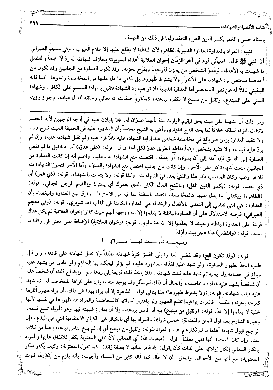 تَنْبِيهٌ: الْمُرَادُ بِالْعَدَاوَةِ الْعَدَاوَةُ الدُّنْيَوِيَّةُ الظَّاهِرَةُ لِأَنَّ الْبَاطِنَةَ لَا يَطَّلِعُ عَلَيْهَا إلَّا عَلَّامُ الْغُيُوبِ، وَفِي مُعْجَمِ الطَّبَرَانِيِّ أَنَّ النَّبِيَّ - صَلَّى اللَّهُ عَلَيْهِ وَسَلَّمَ - قَالَ: «سَيَأْتِي قَوْمٌ فِي آخِرِ الزَّمَانِ إخْوَانُ الْعَلَانِيَةِ أَعْدَاءُ السَّرِيرَةِ» بِخِلَافِ شَهَادَتِهِ لَهُ إذْ لَا تُهْمَةَ وَالْفَضْلُ مَا شَهِدَتْ بِهِ الْأَعْدَاءُ، وَعَدُوُّ الشَّخْصِ مَنْ يَحْزَنُ لِفَرَحِهِ، وَيَفْرَحُ لِحُزْنِهِ. وَقَدْ تَكُونُ الْعَدَاوَةُ مِنْ الْجَانِبَيْنِ وَقَدْ تَكُونُ مِنْ أَحَدِهِمَا فَيَخْتَصُّ بِرَدِّ شَهَادَتِهِ عَلَى الْآخَرِ. وَلَا يُشْتَرَطُ ظُهُورُهَا بَلْ يَكْفِي مَا دَلَّ عَلَيْهَا مِنْ الْمُخَاصَمَةِ وَنَحْوِهَا. كَمَا قَالَهُ الْبُلْقِينِيُّ نَاقِلًا لَهُ عَنْ نَصِّ الْمُخْتَصَرِ أَمَّا الْعَدَاوَةُ الدِّينِيَّةُ فَلَا تُوجِبُ رَدَّ الشَّهَادَةِ فَتُقْبَلُ بِشَهَادَةِ الْمُسْلِمِ عَلَى الْكَافِرِ.