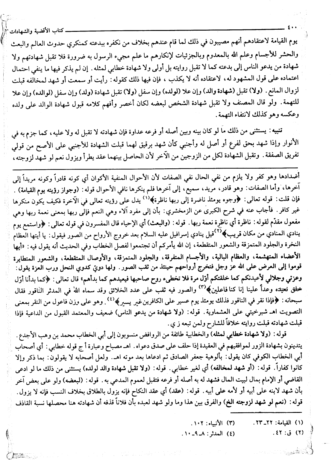 يَوْمَ الْقِيَامَةِ لِاعْتِقَادِهِمْ أَنَّهُمْ مُصِيبُونَ فِي ذَلِكَ لِمَا قَامَ عِنْدَهُمْ بِخِلَافِ مَنْ نُكَفِّرُهُ بِبِدْعَتِهِ كَمُنْكَرِي حُدُوثِ الْعَالَمِ وَالْبَعْثِ وَالْحَشْرِ لِلْأَجْسَامِ وَعِلْمِ اللَّهِ بِالْمَعْدُومِ، وَبِالْجُزْئِيَّاتِ لِإِنْكَارِهِمْ مَا عُلِمَ مَجِيءُ الرَّسُولِ بِهِ ضَرُورَةً فَلَا تُقْبَلُ شَهَادَتُهُمْ وَلَا شَهَادَةُ مَنْ يَدْعُو النَّاسَ إلَى بِدْعَتِهِ كَمَا لَا تُقْبَلُ رِوَايَتُهُ بَلْ أَوْلَى وَلَا شَهَادَةَ خَطَّابِيٍّ لِمِثْلِهِ. إنْ لَمْ يَذْكُرْ فِيهَا مَا يَنْفِي احْتِمَالَ اعْتِمَادِهِ عَلَى قَوْلِ الْمَشْهُودِ لَهُ، لِاعْتِقَادِهِ أَنَّهُ لَا يَكْذِبُ، فَإِنَّ فِيهَا ذَلِكَ كَقَوْلِهِ: رَأَيْت أَوْ سَمِعْت أَوْ شَهِدَ لِمُخَالِفِهِ قُبِلَتْ لِزَوَالِ الْمَانِعِ.