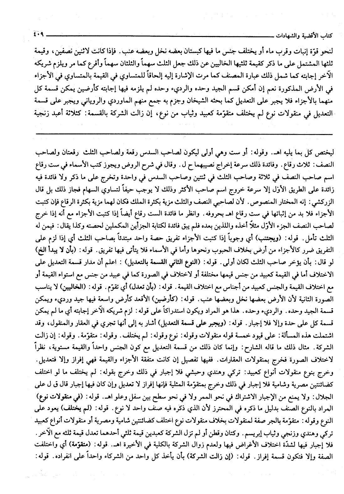 قَوْلُهُ: (كَأَرْضَيْنِ) الْأَوْلَى كَأَرْضٍ وَاسِعَةٍ فِيهَا جَيِّدٌ وَرَدِيءٌ وَيُمْكِنُ قِسْمَةُ الْجَيِّدِ وَحْدَهُ وَالرَّدِيءِ وَحْدَهُ هَذَا هُوَ الْمُرَادُ وَيَكُونُ اسْتِدْرَاكًا عَلَى قَوْلِهِ: لَزِمَ شَرِيكَهُ الْآخَرَ إجَابَتُهُ أَيْ مَا لَمْ يُمْكِنْ قِسْمَةُ كُلٍّ عَلَى حِدَةٍ وَإِلَّا فَلَا إجْبَارَ. قَوْلُهُ: (وَيُجْبَرُ عَلَى قِسْمَةِ التَّعْدِيلِ) أَشَارَ بِهِ إلَى أَنَّهَا تَجْرِي فِي الْعَقَارِ وَالْمَنْقُولِ، وَقَدْ اشْتَمَلَتْ هَذِهِ الْمَسْأَلَةُ: عَلَى قُيُودٍ خَمْسَةٍ قَوْلُهُ مَنْقُولَاتِ وَقَوْلُهُ: نَوْعٍ وَقَوْلُهُ: لَمْ يَخْتَلِفْ. وَقَوْلُهُ: مُتَقَوِّمَةٍ. وَقَوْلُهُ: إنْ زَالَتْ الشَّرِكَةُ. مِثَالُ ذَلِكَ مَا قَالَهُ الشَّارِحُ: وَإِنَّمَا كَانَ ذَلِكَ مِنْ قِسْمَةِ التَّعْدِيلِ مَعَ كَوْنِ الْجِنْسِ وَاحِدًا وَالْقِيمَةِ مُسْتَوِيَةً، نَظَرًا لِاخْتِلَافِ الصُّورَةِ فَخَرَجَ بِمَنْقُولَاتِ الْعَقَارَاتُ فَفِيهَا تَفْصِيلٌ إنْ كَانَتْ مُتَّفِقَةَ الْأَجْزَاءِ وَالْقِيمَةِ فَهِيَ إفْرَازٌ وَإِلَّا فَتَعْدِيلٌ وَخَرَجَ بِنَوْعٍ مَنْقُولَاتُ أَنْوَاعٍ كَعَبِيدٍ: تُرْكِيٍّ وَهِنْدِيٍّ وَحَبَشِيٍّ فَلَا إجْبَارَ فِي ذَلِكَ، وَخَرَجَ بِقَوْلِهِ: لَمْ يَخْتَلِفْ مَا لَوْ اخْتَلَفَ كَضَائِنَتَيْنِ مِصْرِيَّةٍ وَشَامِيَّةٍ فَلَا إجْبَارَ فِي ذَلِكَ، وَخَرَجَ بِمُتَقَوِّمَةٍ الْمِثْلِيَّةُ فَإِنَّهَا إفْرَازٌ لَا تَعْدِيلٌ وَإِنْ كَانَ فِيهَا إجْبَارٌ قَالَ ق ل عَلَى الْجَلَالِ: وَلَا يَمْنَعُ مِنْ الْإِجْبَارِ الِاشْتِرَاكُ فِي نَحْوِ الْمَمَرِّ وَلَا فِي نَحْوِ سَطْحٍ بَيْنَ سُفْلٍ وَعُلْوٍ اهـ قَوْلُهُ: (فِي مَنْقُولَاتِ نَوْعٍ) الْمُرَادُ بِالنَّوْعِ الصِّنْفُ بِدَلِيلِ مَا ذَكَرَهُ فِي الْمُحْتَرَزِ لِأَنَّ الَّذِي ذَكَرَهُ فِيهِ صِنْفٌ وَاحِدٌ لَا نَوْعٌ.