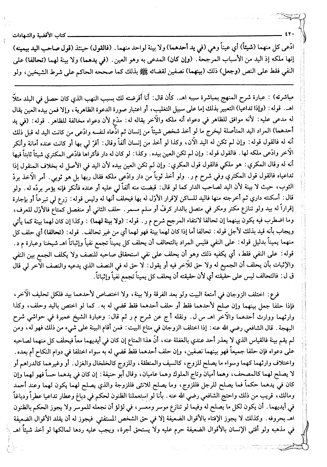 ادَّعَى كُلٌّ مِنْهُمَا (شَيْئًا) أَيْ عَيْنًا وَهِيَ (فِي يَدِ أَحَدِهِمَا) وَلَا بَيِّنَةَ لِوَاحِدٍ مِنْهُمَا. (فَالْقَوْلُ) حِينَئِذٍ (قَوْلُ صَاحِبِ الْيَدِ بِيَمِينِهِ) إنَّهَا مِلْكُهُ إذْ الْيَدُ مِنْ الْأَسْبَابِ الْمُرَجِّحَةِ. (وَإِنْ كَانَ) الْمُدَّعَى بِهِ وَهُوَ الْعَيْنُ. (فِي يَدِهِمَا) وَلَا بَيِّنَةَ لَهُمَا (تَحَالَفَا) عَلَى النَّفْيِ فَقَطْ عَلَى النَّصِّ (وَجُعِلَ) ذَلِكَ (بَيْنَهُمَا) نِصْفَانِ لِقَضَائِهِ - صَلَّى اللَّهُ عَلَيْهِ وَسَلَّمَ - بِذَلِكَ كَمَا صَحَّحَهُ الْحَاكِمُ عَلَى شَرْطِ الشَّيْخَيْنِ، وَلَوْ