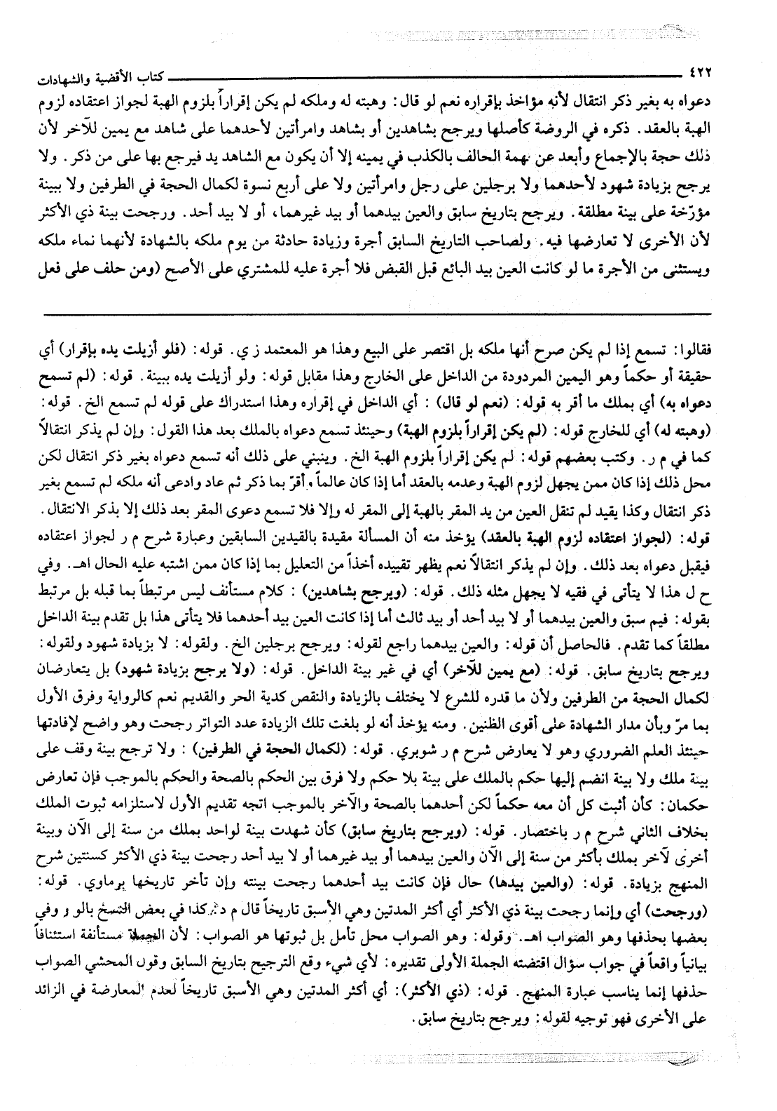 دَعْوَاهُ بِهِ بِغَيْرِ ذِكْرِ انْتِقَالٍ لِأَنَّهُ مُؤَاخَذٌ بِإِقْرَارِهِ، نَعَمْ لَوْ قَالَ: وَهَبْته لَهُ وَمَلَكَهُ لَمْ يَكُنْ إقْرَارًا بِلُزُومِ الْهِبَةِ لِجَوَازِ اعْتِقَادِهِ لُزُومَ الْهِبَةِ بِالْعَقْدِ ذَكَرَهُ فِي الرَّوْضَةِ كَأَصْلِهَا وَيُرَجَّحُ بِشَاهِدَيْنِ أَوْ بِشَاهِدٍ وَامْرَأَتَيْنِ لِأَحَدِهِمَا عَلَى شَاهِدٍ مَعَ يَمِينٍ لِلْآخَرِ لِأَنَّ ذَلِكَ حُجَّةٌ بِالْإِجْمَاعِ وَأَبْعَدُ عَنْ تُهْمَةَ الْحَالِفِ بِالْكَذِبِ فِي يَمِينِهِ إلَّا أَنْ يَكُونَ مَعَ الشَّاهِدِ يَدٌ فَيَرْجِعُ بِهَا عَلَى مَنْ ذُكِرَ. وَلَا يُرَجَّحُ بِزِيَادَةِ شُهُودٍ لِأَحَدِهِمَا وَلَا بِرَجُلَيْنِ عَلَى رَجُلٍ وَامْرَأَتَيْنِ وَلَا عَلَى أَرْبَعِ نِسْوَةٍ لِكَمَالِ الْحُجَّةِ فِي الطَّرَفَيْنِ وَلَا بِبَيِّنَةٍ مُؤَرَّخَةٍ عَلَى بَيِّنَةٍ مُطْلَقَةٍ. وَيَرْجِعُ بِتَارِيخٍ سَابِقٍ وَالْعَيْنُ بِيَدِهِمَا أَوْ بِيَدِ غَيْرِهِمَا، أَوْ لَا بِيَدِ أَحَدٍ. وَرُجِّحَتْ بَيِّنَةُ ذِي الْأَكْثَرِ لِأَنَّ الْأُخْرَى لَا تُعَارِضُهَا فِيهِ. وَلِصَاحِبِ التَّارِيخِ السَّابِقِ أُجْرَةٌ وَزِيَادَةٌ حَادِثَةٌ مِنْ يَوْمِ مَلَكَهُ بِالشَّهَادَةِ لِأَنَّهُمَا نَمَاءُ مِلْكِهِ وَيُسْتَثْنَى مِنْ الْأُجْرَةِ مَا لَوْ كَانَتْ الْعَيْنُ بِيَدِ الْبَائِعِ قَبْلَ الْقَبْضِ فَلَا أُجْرَةَ عَلَيْهِ لِلْمُشْتَرِي عَلَى الْأَصَحِّ.