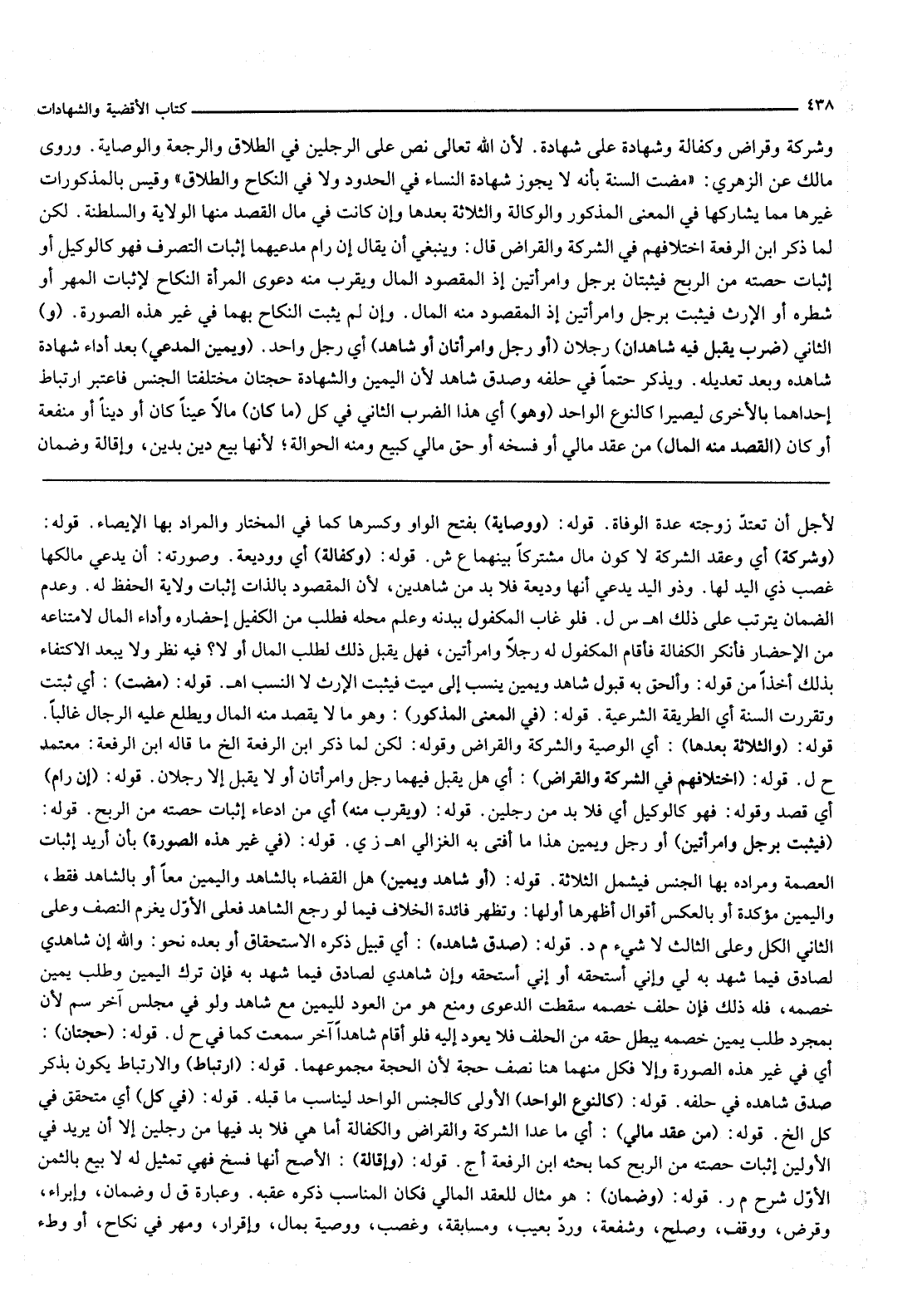 وَشَرِكَةٍ وَقِرَاضٍ وَكَفَالَةٍ وَشَهَادَةٍ عَلَى شَهَادَةٍ لِأَنَّ اللَّهَ تَعَالَى نَصَّ عَلَى الرَّجُلَيْنِ فِي الطَّلَاقِ وَالرَّجْعَةِ وَالْوِصَايَةِ. وَرَوَى مَالِكٌ عَنْ الزُّهْرِيِّ: «مَضَتْ السُّنَّةُ بِأَنَّهُ لَا يَجُوزُ شَهَادَةُ النِّسَاءِ فِي الْحُدُودِ وَلَا فِي النِّكَاحِ وَالطَّلَاقِ» وَقِيسَ بِالْمَذْكُورَاتِ غَيْرُهَا مِمَّا يُشَارِكُهَا فِي الْمَعْنَى الْمَذْكُورِ، وَالْوَكَالَةُ وَالثَّلَاثَةُ بَعْدَهَا وَإِنْ كَانَتْ فِي مَالٍ الْقَصْدُ مِنْهَا الْوِلَايَةُ وَالسَّلْطَنَةُ. لَكِنْ لَمَّا ذَكَرَ ابْنُ الرِّفْعَةِ اخْتِلَافَهُمْ فِي الشَّرِكَةِ وَالْقِرَاضِ قَالَ: وَيَنْبَغِي أَنْ يُقَالَ إنْ رَامَ مُدَّعِيهمَا إثْبَاتَ التَّصَرُّفِ فَهُوَ كَالْوَكِيلِ أَوْ إثْبَاتَ حِصَّتِهِ مِنْ الرِّبْحِ فَيَثْبُتَانِ بِرَجُلٍ وَامْرَأَتَيْنِ إذْ الْمَقْصُودُ الْمَالُ وَيَقْرُبُ مِنْهُ دَعْوَى الْمَرْأَةِ النِّكَاحَ لِإِثْبَاتِ الْمَهْرِ أَوْ شَطْرِهِ أَوْ الْإِرْثِ فَيَثْبُتُ بِرَجُلٍ وَامْرَأَتَيْنِ إذْ الْمَقْصُودُ مِنْهُ الْمَالُ. وَإِنْ لَمْ يَثْبُتْ النِّكَاحُ بِهِمَا فِي غَيْرِ هَذِهِ الصُّورَةِ.