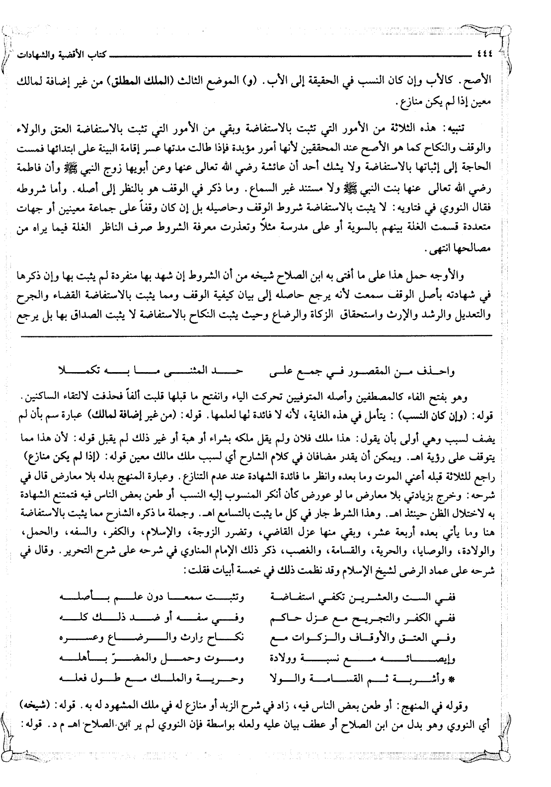 تَنْبِيهٌ: هَذِهِ الثَّلَاثَةُ مِنْ الْأُمُورِ الَّتِي تَثْبُتُ بِالِاسْتِفَاضَةِ وَبَقِيَ مِنْ الْأُمُورِ الَّتِي تَثْبُتُ بِالِاسْتِفَاضَةِ الْعِتْقُ وَالْوَلَاءُ وَالْوَقْفُ وَالنِّكَاحُ كَمَا هُوَ الْأَصَحُّ عِنْدَ الْمُحَقِّقِينَ لِأَنَّهَا أُمُورٌ مُؤَبَّدَةٌ فَإِذَا طَالَتْ مُدَّتُهَا عَسُرَ إقَامَةُ الْبَيِّنَةِ عَلَى ابْتِدَائِهَا فَمَسَّتْ الْحَاجَةُ إلَى إثْبَاتِهَا بِالِاسْتِفَاضَةِ وَلَا يَشُكُّ أَحَدٌ أَنَّ عَائِشَةَ - رَضِيَ اللَّهُ عَنْهَا - وَعَنْ أَبَوَيْهَا زَوْجُ النَّبِيِّ - صَلَّى اللَّهُ عَلَيْهِ وَسَلَّمَ - وَأَنَّ فَاطِمَةَ - رَضِيَ اللَّهُ تَعَالَى عَنْهَا - بِنْتُ النَّبِيِّ - صَلَّى اللَّهُ عَلَيْهِ وَسَلَّمَ - وَلَا مُسْتَنَدَ غَيْرُ السَّمَاعِ. وَمَا ذُكِرَ فِي الْوَقْفِ هُوَ بِالنَّظَرِ إلَى أَصْلِهِ. وَأَمَّا شُرُوطُهُ فَقَالَ النَّوَوِيُّ فِي فَتَاوِيهِ: لَا يَثْبُتُ بِالِاسْتِفَاضَةِ شُرُوطُ الْوَقْفِ وَتَفَاصِيلُهُ بَلْ إنْ كَانَ وَقْفًا عَلَى جَمَاعَةٍ مُعَيَّنِينَ أَوْ جِهَاتٍ مُتَعَدِّدَةٍ قُسِمَتْ الْغَلَّةُ بَيْنَهُمْ بِالسَّوِيَّةِ أَوْ عَلَى مَدْرَسَةٍ مَثَلًا وَتَعَذَّرَتْ مَعْرِفَةُ الشُّرُوطِ صَرَفَ النَّاظِرُ الْغَلَّةِ فِيمَا يَرَاهُ مِنْ مَصَالِحِهَا انْتَهَى. وَالْأَوْجَهُ حَمْلُ هَذَا عَلَى مَا أَفْتَى بِهِ ابْنُ الصَّلَاحِ شَيْخُهُ مِنْ أَنَّ الشُّرُوطَ إنْ شَهِدَ بِهَا مُنْفَرِدَةً لَمْ يَثْبُتْ بِهَا وَإِنْ ذَكَرَهَا فِي شَهَادَتِهِ بِأَصْلِ الْوَقْفِ سُمِعَتْ لِأَنَّهُ يَرْجِعُ حَاصِلُهُ إلَى بَيَانِ كَيْفِيَّةِ الْوَقْفِ، وَمِمَّا يَثْبُتُ بِالِاسْتِفَاضَةِ الْقَضَاءُ وَالْجَرْحُ وَالتَّعْدِيلُ وَالرُّشْدُ وَالْإِرْثُ وَاسْتِحْقَاقُ الزَّكَاةِ وَالرَّضَاعُ وَحَيْثُ يَثْبُتُ النِّكَاحُ بِالِاسْتِفَاضَةِ لَا يَثْبُتُ الصَّدَاقُ بِهَا بَلْ يَرْجِعُ