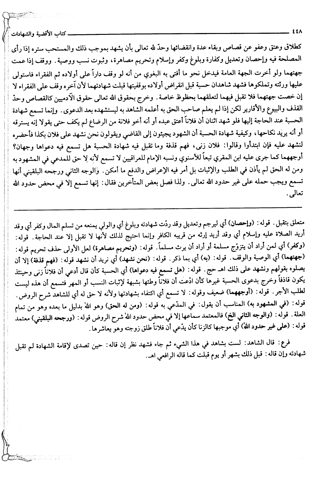 كَطَلَاقٍ وَعِتْقٍ وَعَفْوٍ عَنْ قِصَاصٍ وَبَقَاءِ عِدَّةٍ وَانْقِضَائِهَا وَحَدٍّ لِلَّهِ تَعَالَى بِأَنْ يَشْهَدَ بِمُوجِبِ ذَلِكَ وَالْمُسْتَحَبُّ سَتْرُهُ إذَا رَأَى الْمَصْلَحَةَ فِيهِ وَإِحْصَانٍ وَتَعْدِيلٍ وَكَفَّارَةٍ وَبُلُوغٍ وَكُفْرٍ وَإِسْلَامٍ وَتَحْرِيمِ مُصَاهَرَةٍ، وَثُبُوتِ نَسَبٍ وَوَصِيَّةٍ وَوَقْفٍ إذَا عَمَّتْ جِهَتُهُمَا وَلَوْ أُخِّرَتْ الْجِهَةُ الْعَامَّةُ فَيَدْخُلُ نَحْوُ مَا أَفْتَى بِهِ الْبَغَوِيّ مِنْ أَنَّهُ لَوْ وَقَفَ دَارًا عَلَى أَوْلَاده ثُمَّ الْفُقَرَاءِ فَاسْتَوْلَى عَلَيْهَا وَرَثَتُهُ وَتَمَلَّكُوهَا فَشَهِدَ شَاهِدَانِ حِسْبَةً قَبْلَ انْقِرَاضِ أَوْلَادِهِ بِوَقْفِيَّتِهَا قُبِلَتْ شَهَادَتُهُمَا لِأَنَّ آخِرَهُ وَقْفٌ عَلَى الْفُقَرَاءِ لَا إنْ خُصَّتْ جِهَتُهُمَا فَلَا تُقْبَلُ فِيهِمَا لِتَعَلُّقِهِمَا بِحُظُوظٍ خَاصَّةٍ. وَخَرَجَ بِحُقُوقِ اللَّهِ تَعَالَى حُقُوقُ الْآدَمِيِّينَ كَالْقِصَاصِ وَحَدِّ الْقَذْفِ وَالْبُيُوعِ وَالْأَقَارِيرِ لَكِنْ إذَا لَمْ يَعْلَمْ صَاحِبُ الْحَقِّ بِهِ أَعْلَمَهُ الشَّاهِدُ بِهِ لِيَسْتَشْهِدَهُ بَعْدَ الدَّعْوَى. وَإِنَّمَا تُسْمَعُ شَهَادَةُ الْحِسْبَةِ عِنْدَ الْحَاجَةِ إلَيْهَا فَلَوْ شَهِدَ اثْنَانِ أَنَّ فُلَانًا أَعْتَقَ عَبْدَهُ أَوْ أَنَّهُ أَخُو فُلَانَةَ مِنْ الرَّضَاعِ لَمْ يَكْفِ حَتَّى يَقُولَا إنَّهُ يَسْتَرِقُّهُ أَوْ أَنَّهُ يُرِيدُ نِكَاحَهَا، وَكَيْفِيَّةُ شَهَادَةِ الْحِسْبَةِ أَنَّ الشُّهُودَ يَجِيئُونَ إلَى الْقَاضِي وَيَقُولُونَ نَحْنُ نَشْهَدُ عَلَى فُلَانٍ بِكَذَا فَأَحْضِرْهُ لِنَشْهَدَ عَلَيْهِ فَإِنْ ابْتَدَءُوا وَقَالُوا: فُلَانٌ زَنَى، فَهُمْ قَذَفَةٌ وَمَا تُقْبَلُ فِيهِ شَهَادَةُ الْحِسْبَةِ هَلْ تُسْمَعُ فِيهِ دَعْوَاهَا وَجْهَانِ؟ أَوْجَهُهُمَا كَمَا جَرَى عَلَيْهِ ابْنُ الْمُقْرِي تَبَعًا لِلْإِسْنَوِيِّ وَنَسَبَهُ الْإِمَامُ لِلْعِرَاقِيِّينَ لَا تُسْمَعُ لِأَنَّهُ لَا حَقَّ لِلْمُدَّعِي فِي الْمَشْهُودِ بِهِ وَمَنْ لَهُ الْحَقُّ لَمْ يَأْذَنْ فِي الطَّلَبِ وَالْإِثْبَاتِ بَلْ أَمَرَ فِيهِ بِالْإِعْرَاضِ وَالدَّفْعِ مَا أَمْكَنَ. وَالْوَجْهُ الثَّانِي وَرَجَّحَهُ الْبُلْقِينِيُّ أَنَّهَا تُسْمَعُ وَيَجِبُ حَمْلُهُ عَلَى غَيْرِ حُدُودِ اللَّهِ تَعَالَى. وَلِذَا فَصَّلَ بَعْضُ الْمُتَأَخِّرِينَ فَقَالَ: إنَّهَا تُسْمَعُ إلَّا فِي مَحْضِ حُدُودِ اللَّهِ تَعَالَى.