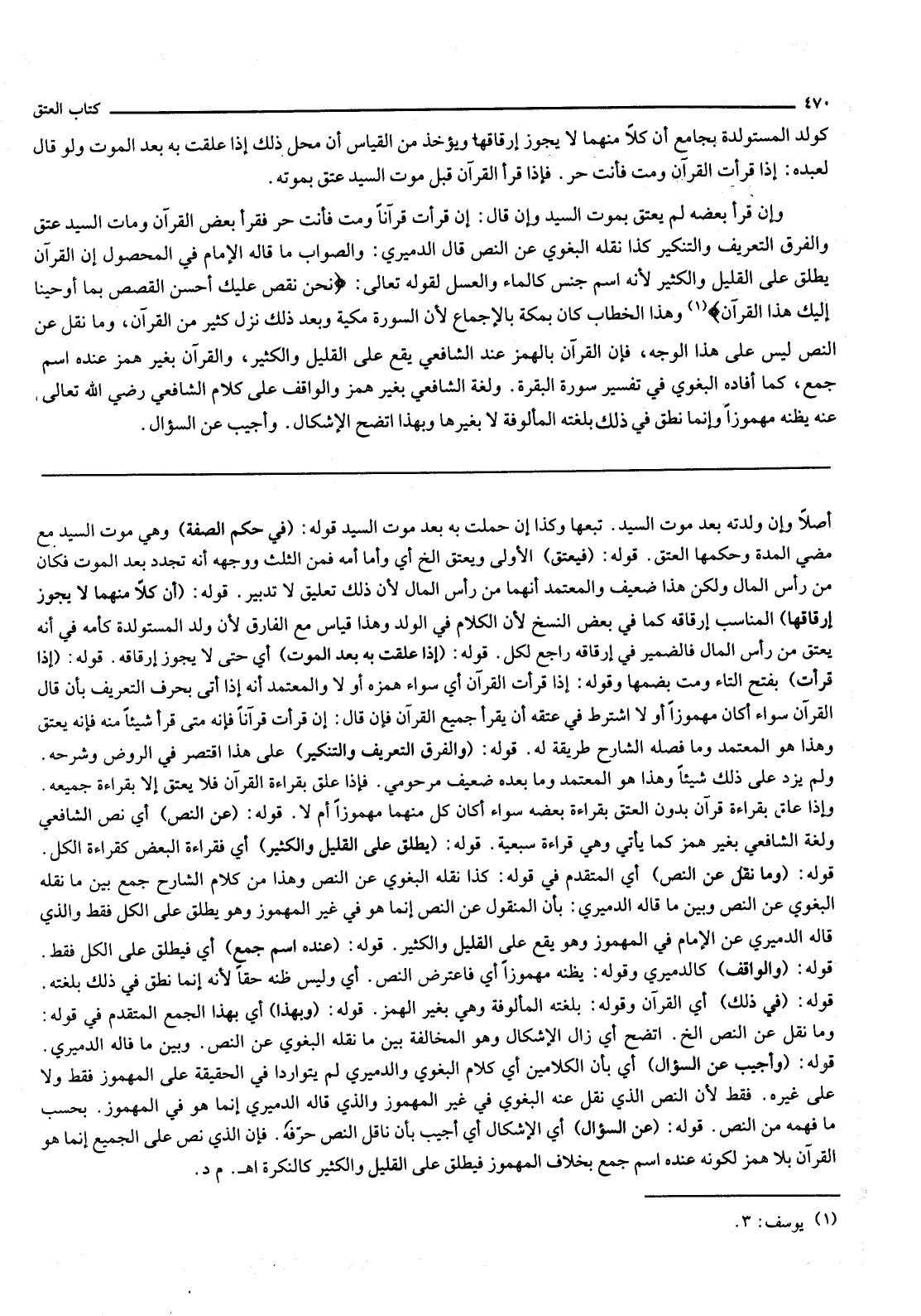 وَإِنْ قَرَأَ بَعْضَهُ لَمْ يَعْتِقْ بِمَوْتِ السَّيِّدِ وَإِنْ قَالَ: إنْ قَرَأْتَ قُرْآنًا وَمُتُّ فَأَنْتَ حُرٌّ فَقَرَأَ بَعْضَ الْقُرْآنِ وَمَاتَ السَّيِّدُ عَتَقَ وَالْفَرْقُ التَّعْرِيفُ وَالتَّنْكِيرُ كَذَا نَقَلَهُ الْبَغَوِيّ عَنْ النَّصِّ قَالَ الدَّمِيرِيُّ: وَالصَّوَابُ مَا قَالَهُ الْإِمَامُ فِي الْمَحْصُولِ إنَّ الْقُرْآنَ يُطْلَقُ عَلَى الْقَلِيلِ وَالْكَثِيرِ لِأَنَّهُ اسْمُ جِنْسٍ كَالْمَاءِ وَالْعَسَلِ لِقَوْلِهِ تَعَالَى {نَحْنُ نَقُصُّ عَلَيْكَ أَحْسَنَ الْقَصَصِ بِمَا أَوْحَيْنَا إِلَيْكَ هَذَا الْقُرْآنَ} [يوسف: 3] وَهَذَا الْخِطَابُ كَانَ بِمَكَّةَ بِالْإِجْمَاعِ لِأَنَّ السُّورَةَ مَكِّيَّةٌ وَبَعْدَ ذَلِكَ نَزَلَ كَثِيرٌ مِنْ الْقُرْآنِ، وَمَا نُقِلَ عَنْ النَّصِّ لَيْسَ عَلَى هَذَا الْوَجْهِ، فَإِنَّ الْقُرْآنَ بِالْهَمْزِ عِنْدَ الشَّافِعِيِّ يَقَعُ عَلَى الْقَلِيلِ وَالْكَثِيرِ، وَالْقُرْآنُ بِغَيْرِ هَمْزٍ عِنْدَهُ اسْمُ جَمْعٍ، كَمَا أَفَادَهُ الْبَغَوِيّ فِي تَفْسِيرِ سُورَةِ الْبَقَرَةِ. وَلُغَةُ الشَّافِعِيِّ غَيْرُ هَمْزٍ وَالْوَاقِفُ عَلَى كَلَامِ الشَّافِعِيِّ - رَضِيَ اللَّهُ تَعَالَى عَنْهُ - يَظُنُّهُ مَهْمُوزًا وَإِنَّمَا نَطَقَ فِي ذَلِكَ بِلُغَتِهِ الْمَأْلُوفَةِ لَا بِغَيْرِهَا وَبِهَذَا اتَّضَحَ الْإِشْكَالُ. وَأُجِيبَ عَنْ السُّؤَالِ.