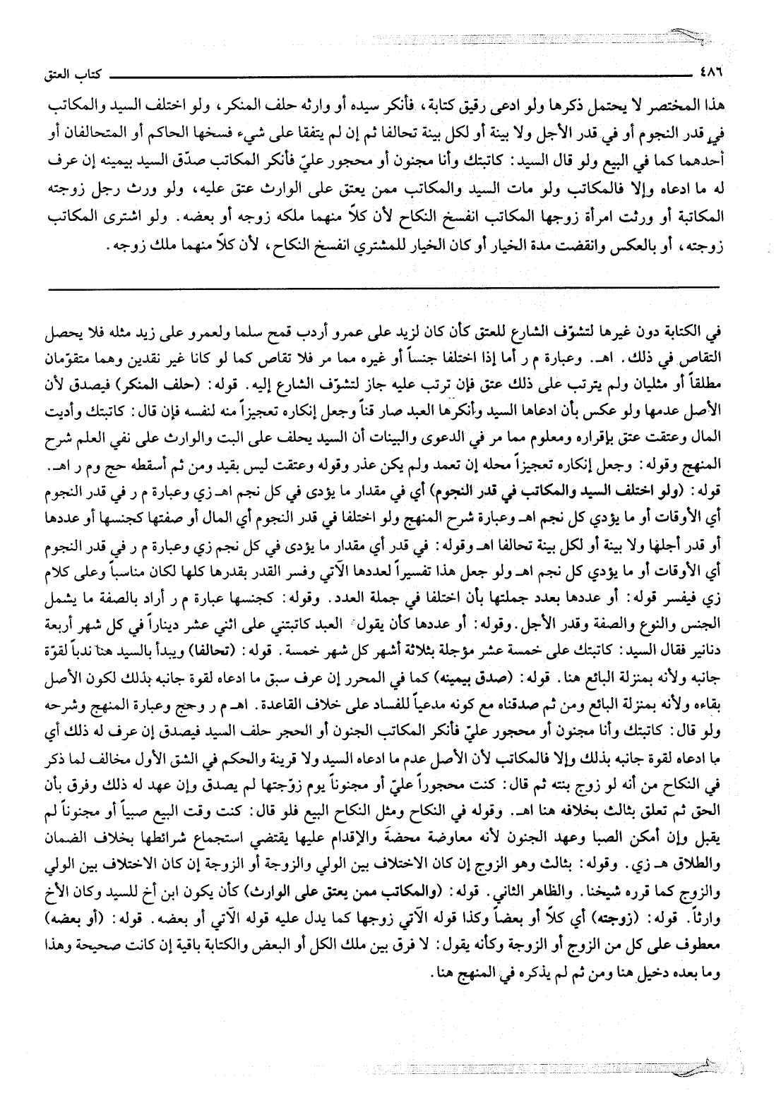 وَلَوْ ادَّعَى رَقِيقٌ كِتَابَةً، فَأَنْكَرَ سَيِّدُهُ أَوْ وَارِثُهُ حَلَفَ الْمُنْكِرُ، وَلَوْ اخْتَلَفَ السَّيِّدُ وَالْمُكَاتَبُ فِي قَدْرِ النُّجُومِ أَوْ قَدْرِ الْأَجَلِ وَلَا بَيِّنَةَ أَوْ لِكُلٍّ بَيِّنَةٌ تَحَالَفَا ثُمَّ إنْ لَمْ يَتَّفِقَا عَلَى شَيْءٍ فَسَخَهَا الْحَاكِمُ أَوْ الْمُتَحَالِفَانِ أَوْ أَحَدُهُمَا كَمَا فِي الْبَيْعِ وَلَوْ قَالَ السَّيِّدُ: كَاتَبْتُك وَأَنَا مَجْنُونٌ أَوْ مَحْجُورٌ عَلَيَّ فَأَنْكَرَ الْمُكَاتَبُ صُدِّقَ السَّيِّدُ بِيَمِينِهِ إنْ عُرِفَ لَهُ مَا ادَّعَاهُ وَإِلَّا فَالْمُكَاتَبُ وَلَوْ مَاتَ السَّيِّدُ وَالْمُكَاتَبُ مِمَّنْ يَعْتِقُ عَلَى الْوَارِثِ عَتَقَ عَلَيْهِ، وَلَوْ وَرِثَ رَجُلٌ زَوْجَتَهُ الْمُكَاتَبَةَ أَوْ وَرِثَتْ امْرَأَةٌ زَوْجَهَا الْمُكَاتَبَ انْفَسَخَ النِّكَاحُ لِأَنَّ كُلًّا مِنْهُمَا مَلَكَ زَوْجَهُ أَوْ بَعْضَهُ. وَلَوْ اشْتَرَى الْمُكَاتَبُ زَوْجَتَهُ، أَوْ بِالْعَكْسِ وَانْقَضَتْ مُدَّةُ الْخِيَارِ أَوْ كَانَ الْخِيَارُ لِلْمُشْتَرِي انْفَسَخَ النِّكَاحُ، لِأَنَّ كُلًّا مِنْهُمَا مَلَكَ زَوْجَهُ.
