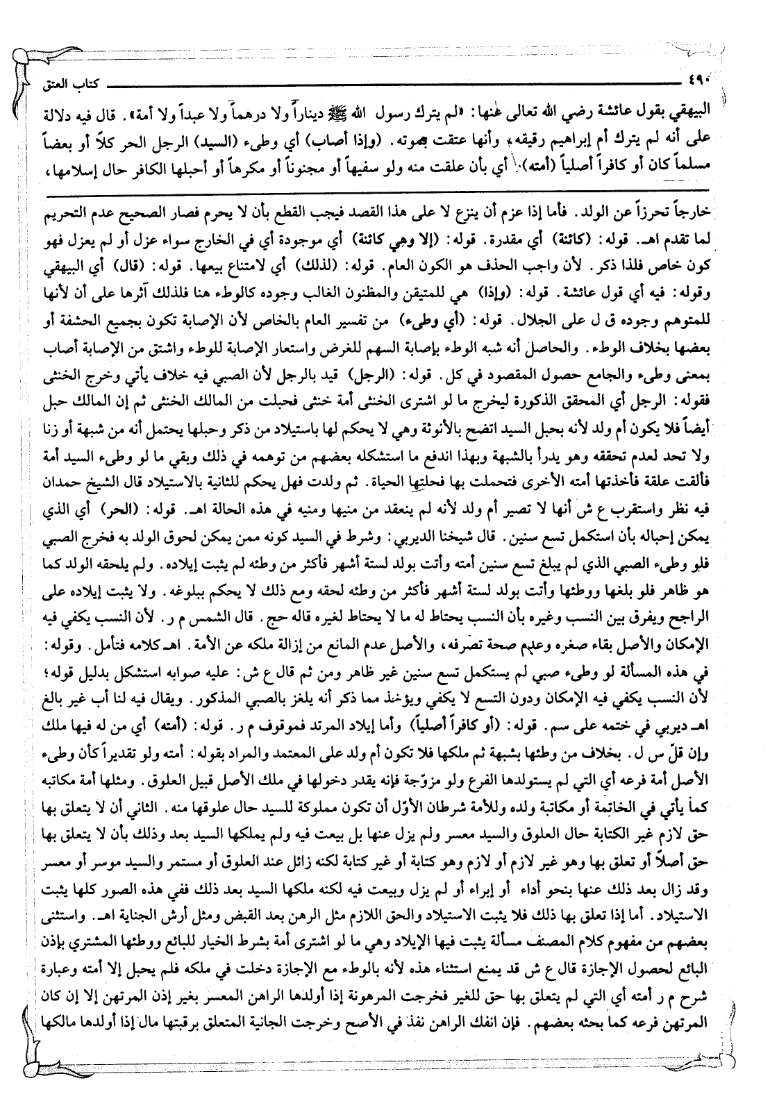 الْبَيْهَقِيُّ بِقَوْلِ عَائِشَةَ - رَضِيَ اللَّهُ تَعَالَى عَنْهَا -: «لَمْ يَتْرُكْ رَسُولُ اللَّهِ - صَلَّى اللَّهُ عَلَيْهِ وَسَلَّمَ - دِينَارًا وَلَا دِرْهَمًا وَلَا عَبْدًا وَلَا أَمَةً» . قَالَ فِيهِ دَلَالَةٌ عَلَى أَنَّهُ لَمْ يَتْرُكْ أُمَّ إبْرَاهِيمَ رَقِيقَةً، وَأَنَّهَا عَتَقَتْ بِمَوْتِهِ. (وَإِذَا أَصَابَ) أَيْ وَطِئَ (السَّيِّدُ) الرَّجُلُ الْحُرُّ كُلًّا أَوْ بَعْضًا مُسْلِمًا كَانَ أَوْ كَافِرًا أَصْلِيًّا (أَمَتَهُ) أَيْ بِأَنْ عَلِقَتْ مِنْهُ وَلَوْ سَفِيهًا أَوْ مَجْنُونًا أَوْ مُكْرَهًا أَوْ أَحْبَلَهَا الْكَافِرُ حَالَ إسْلَامِهَا،