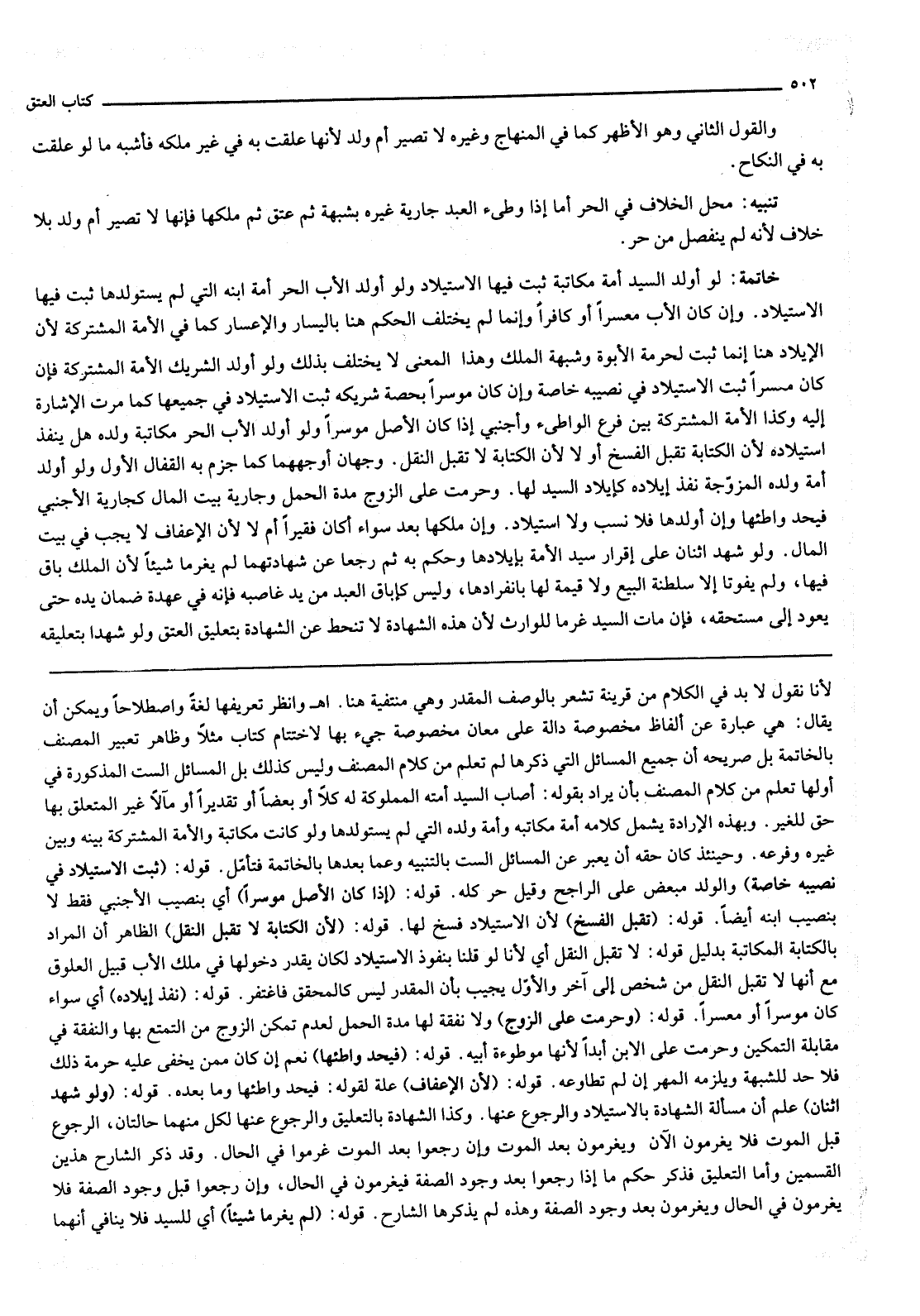 ـــــــــــــــــــــــــــــQلِأَنَّا نَقُولُ لَا بُدَّ فِي الْكَلَامِ مِنْ قَرِينَةٍ تُشْعِرُ بِالْوَصْفِ الْمُقَدَّرِ وَهِيَ مُنْتَفِيَةٌ هُنَا اهـ وَانْظُرْ تَعْرِيفَهَا لُغَةً وَاصْطِلَاحًا وَيُمْكِنُ أَنْ يُقَالَ هِيَ عِبَارَةٌ عَنْ أَلْفَاظٍ مَخْصُوصَةٍ دَالَّةٌ عَلَى مَعَانٍ مَخْصُوصَةٍ جِيءَ بِهَا لِاخْتِتَامِ كِتَابٍ مَثَلًا وَظَاهِرُ تَعْبِيرِ الْمُصَنِّفِ بِالْخَاتِمَةِ بَلْ صَرِيحُهُ أَنَّ جَمِيعَ الْمَسَائِلِ الَّتِي ذَكَرَهَا لَمْ تُعْلَمْ مِنْ كَلَامِ الْمُصَنِّفِ وَلَيْسَ كَذَلِكَ بَلْ الْمَسَائِلُ السِّتُّ الْمَذْكُورَةُ فِي أَوَّلِهَا تُعْلَمُ مِنْ كَلَامِ الْمُصَنِّفِ بِأَنْ يُرَادَ بِقَوْلِهِ: أَصَابَ السَّيِّدُ أَمَتَهُ الْمَمْلُوكَةَ لَهُ كُلًّا أَوْ بَعْضًا أَوْ تَقْدِيرًا أَوْ مَآلًا غَيْرَ الْمُتَعَلِّقِ بِهَا حَقٌّ لِلْغَيْرِ. وَبِهَذِهِ الْإِرَادَةِ يَشْمَلُ كَلَامُهُ أَمَةَ مُكَاتَبِهِ وَأَمَةَ وَلَدِهِ الَّتِي لَمْ يَسْتَوْلِدْهَا وَلَوْ كَانَتْ مُكَاتَبَةً وَالْأَمَةُ الْمُشْتَرَكَةُ بَيْنَهُ وَبَيْنَ غَيْرِهِ وَفَرْعِهِ. وَحِينَئِذٍ كَانَ حَقُّهُ أَنْ يُعَبِّرَ عَنْ الْمَسَائِلِ السِّتِّ بِالتَّنْبِيهِ وَعَمَّا بَعْدَهَا بِالْخَاتِمَةِ فَتَأَمَّلْ.