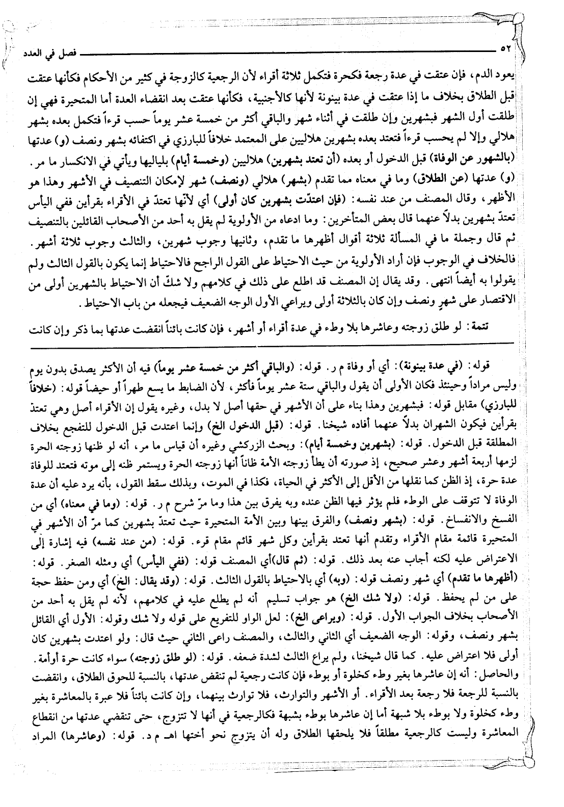 يَعُودَ الدَّمُ، فَإِنْ عَتَقَتْ فِي عِدَّةِ رَجْعَةٍ فَكَحُرَّةٍ فَتُكْمِلُ ثَلَاثَةَ أَقْرَاءٍ لِأَنَّ الرَّجْعِيَّةَ كَالزَّوْجَةِ فِي كَثِيرٍ مِنْ الْأَحْكَامِ فَكَأَنَّهَا عَتَقَتْ قَبْلَ الطَّلَاقِ بِخِلَافِ مَا إذَا عَتَقَتْ فِي عِدَّةِ بَيْنُونَةٍ لِأَنَّهَا كَالْأَجْنَبِيَّةِ، فَكَأَنَّهَا عَتَقَتْ بَعْدَ انْقِضَاءِ الْعِدَّةِ أَمَّا الْمُتَحَيِّرَةُ فَهِيَ إنْ طَلُقَتْ أَوَّلَ الشَّهْرِ فَبِشَهْرَيْنِ وَإِنْ طَلُقَتْ فِي أَثْنَاءِ شَهْرٍ وَالْبَاقِي أَكْثَرُ مِنْ خَمْسَةَ عَشَرَ يَوْمًا حُسِبَ قُرْءًا فَتُكْمِلُ بَعْدَهُ بِشَهْرٍ هِلَالِيٍّ وَإِلَّا لَمْ يُحْسَبْ قُرْءًا فَتَعْتَدُّ بَعْدَهُ بِشَهْرَيْنِ هِلَالِيَّيْنِ عَلَى الْمُعْتَمَدِ خِلَافًا لِلْبَارِزِيِّ فِي اكْتِفَائِهِ بِشَهْرٍ وَنِصْفٍ (وَ) عِدَّتُهَا (بِالشُّهُورِ عَنْ الْوَفَاةِ) قَبْلَ الدُّخُولِ أَوْ بَعْدَهُ (أَنْ تَعْتَدَّ بِشَهْرَيْنِ) هِلَالِيَّيْنِ (وَخَمْسَةِ أَيَّامٍ) بِلَيَالِيِهَا وَيَأْتِي فِي الِانْكِسَارِ مَا مَرَّ. (وَ) عِدَّتُهَا (عَنْ الطَّلَاقِ) وَمَا فِي مَعْنَاهُ مِمَّا تَقَدَّمَ (بِشَهْرٍ) هِلَالِيٍّ (وَنِصْفِ) شَهْرٍ لِإِمْكَانِ التَّنْصِيفِ فِي الْأَشْهُرِ وَهَذَا هُوَ الْأَظْهَرُ، وَقَالَ الْمُصَنِّفُ مِنْ عِنْدِ نَفْسِهِ: (فَإِنْ اعْتَدَّتْ بِشَهْرَيْنِ كَانَ أَوْلَى) أَيْ لِأَنَّهَا تَعْتَدُّ فِي الْأَقْرَاءِ بِقُرْأَيْنِ فَفِي الْيَأْسِ تَعْتَدُّ بِشَهْرَيْنِ بَدَلًا عَنْهُمَا قَالَ بَعْضُ الْمُتَأَخِّرِينَ: وَمَا ادَّعَاهُ مِنْ الْأَوْلَوِيَّةِ لَمْ يَقُلْ بِهِ أَحَدٌ مِنْ الْأَصْحَابِ الْقَائِلِينَ بِالتَّنْصِيفِ ثُمَّ قَالَ وَجُمْلَةُ مَا فِي الْمَسْأَلَةِ ثَلَاثَةُ أَقْوَالٍ أَظْهَرُهَا مَا تَقَدَّمَ، وَثَانِيهَا وُجُوبُ شَهْرَيْنِ، وَالثَّالِثُ وُجُوبُ ثَلَاثَةِ أَشْهُرٍ. فَالْخِلَافُ فِي الْوُجُوبِ فَإِنْ أَرَادَ الْأَوْلَوِيَّةَ مِنْ حَيْثُ الِاحْتِيَاطُ عَلَى الْقَوْلِ الرَّاجِحِ فَالِاحْتِيَاطُ إنَّمَا يَكُونُ بِالْقَوْلِ الثَّالِثِ وَلَمْ يَقُولُوا بِهِ أَيْضًا انْتَهَى. وَقَدْ يُقَالُ إنَّ الْمُصَنِّفَ قَدْ اطَّلَعَ عَلَى ذَلِكَ فِي كَلَامِهِمْ وَلَا شَكَّ أَنَّ الِاحْتِيَاطَ بِالشَّهْرَيْنِ أَوْلَى مِنْ الِاقْتِصَارِ عَلَى شَهْرٍ وَنِصْفِ وَإِنْ كَانَ بِالثَّلَاثَةِ أَوْلَى وَيُرَاعِي الْأَوَّلُ الْوَجْهَ الضَّعِيفَ فَيَجْعَلُهُ مِنْ بَابِ الِاحْتِيَاطِ.