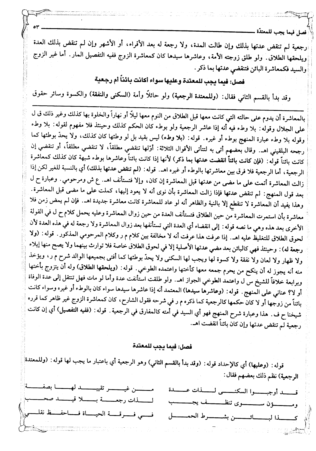 ِ قَوْلُهُ: (وَعَلَيْهَا) أَيْ كَالْإِحْدَادِ قَوْلُهُ: (وَقَدْ بَدَأَ بِالْقِسْمِ الثَّانِي) وَهُوَ الرَّجْعِيَّةُ أَيْ بِاعْتِبَارِ مَا يَجِبُ لَهَا قَوْلُهُ: (وَلِلْمُعْتَدَّةِ الرَّجْعِيَّةِ) نَظَمَ ذَلِكَ بَعْضُهُمْ فَقَالَ: