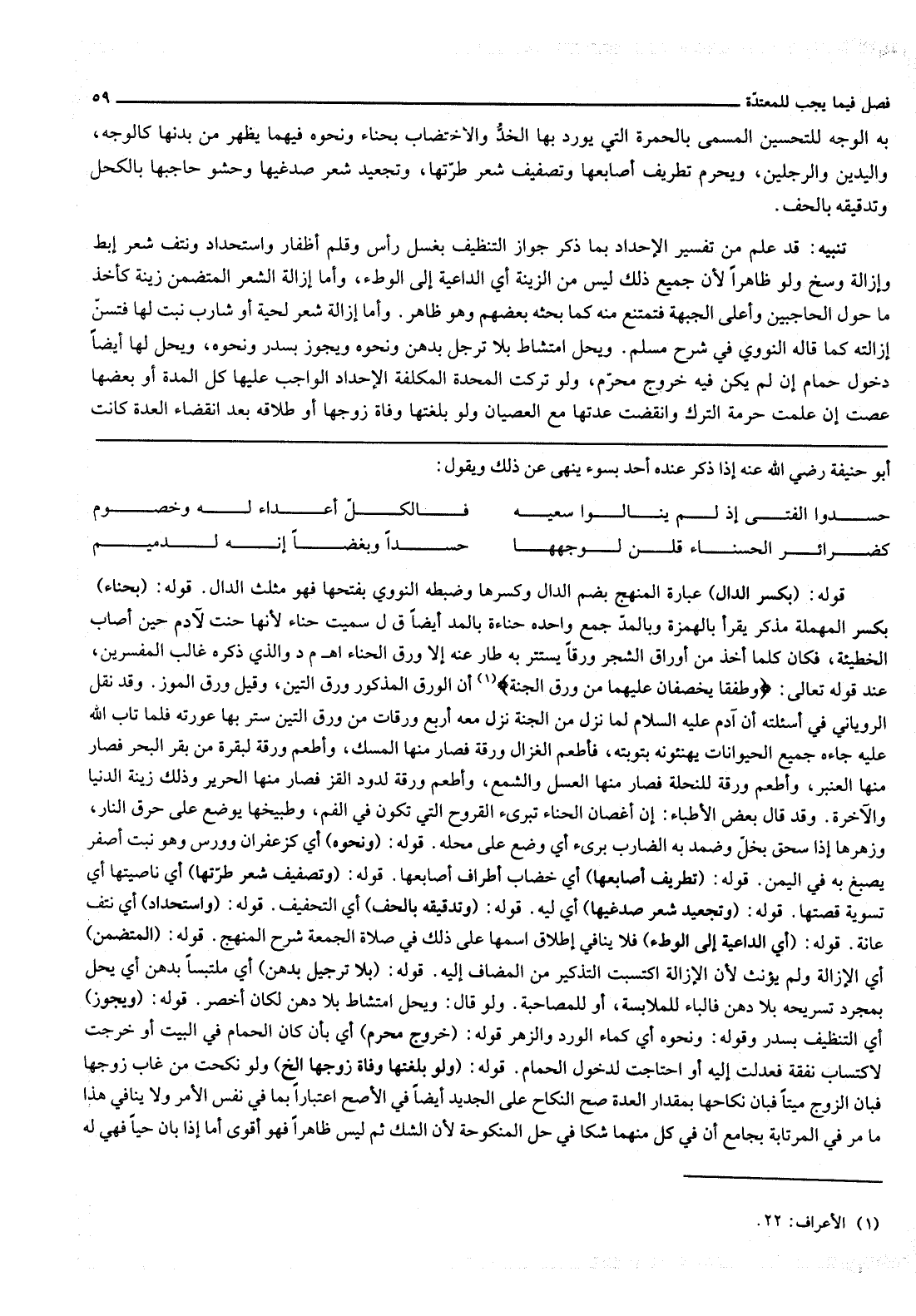 تَنْبِيهٌ: قَدْ عُلِمَ مِنْ تَفْسِيرِ الْإِحْدَادِ بِمَا ذُكِرَ جَوَازُ التَّنْظِيفِ بِغَسْلِ رَأْسٍ وَقَلْمِ أَظْفَارٍ وَاسْتِحْدَادٍ وَنَتْفِ شَعْرِ إبِطٍ وَإِزَالَةِ وَسَخٍ وَلَوْ ظَاهِرًا لِأَنَّ جَمِيعَ ذَلِكَ لَيْسَ مِنْ الزِّينَةِ أَيْ الدَّاعِيَةِ إلَى الْوَطْءِ، وَأَمَّا إزَالَةُ الشَّعْرِ الْمُتَضَمِّنِ زِينَةً كَأَخْذِ مَا حَوْلَ الْحَاجِبَيْنِ وَأَعْلَى الْجَبْهَةِ فَتَمْتَنِعُ مِنْهُ كَمَا بَحَثَهُ بَعْضُهُمْ وَهُوَ ظَاهِرٌ. وَأَمَّا إزَالَةُ شَعْرِ لِحْيَةٍ أَوْ شَارِبٍ نَبَتَ لَهَا فَتُسَنُّ إزَالَتُهُ كَمَا قَالَهُ النَّوَوِيُّ فِي شَرْحِ مُسْلِمٍ. وَيَحِلُّ امْتِشَاطٌ بِلَا تَرَجُّلٍ بِدُهْنٍ وَنَحْوِهِ وَيَجُوزُ بِسِدْرٍ وَنَحْوِهِ، وَيَحِلُّ لَهَا أَيْضًا دُخُولُ حَمَّامٍ إنْ لَمْ يَكُنْ فِيهِ خُرُوجُ مُحَرَّمٍ، وَلَوْ تَرَكَتْ الْمُحِدَّةُ الْمُكَلَّفَةُ الْإِحْدَادَ الْوَاجِبَ عَلَيْهَا كُلَّ الْمُدَّةِ أَوْ بَعْضَهَا عَصَتْ إنْ عَلِمَتْ حُرْمَةَ التَّرْكِ وَانْقَضَتْ عِدَّتُهَا مَعَ الْعِصْيَانِ وَلَوْ بَلَغَتْهَا وَفَاةُ زَوْجِهَا أَوْ طَلَاقُهُ بَعْدَ انْقِضَاءِ الْعِدَّةِ كَانَتْ