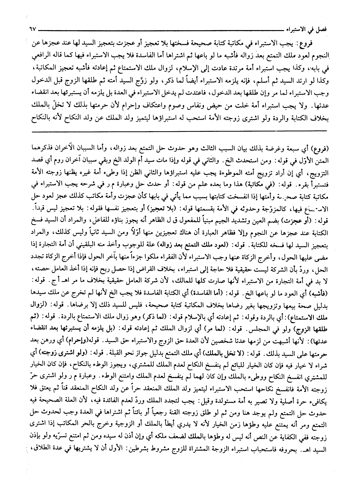 وَقِيلَ: يَجِبُ لِتَجَدُّدِ الْمِلْكِ وَرُدَّ لِعَدَمِ الْفَائِدَةِ فِيهِ، لِأَنَّ الْعِلَّةَ الصَّحِيحَةَ فِيهِ حُدُوثُ حِلِّ التَّمَتُّعِ وَلَمْ يُوجَدْ هُنَا وَمِنْ ثَمَّ لَوْ طَلَّقَ زَوْجَتَهُ الْقِنَّةَ رَجْعِيًّا أَوْ بَائِنًا ثُمَّ اشْتَرَاهَا فِي الْعِدَّةِ وَجَبَ لِحُدُوثِ حِلِّ التَّمَتُّعِ وَمَرَّ أَنَّهُ يَمْتَنِعُ عَلَيْهِ وَطْؤُهَا زَمَنَ الْخِيَارِ لِأَنَّهُ لَا يَدْرِي أَيَطَأُ بِالْمِلْكِ أَوْ الزَّوْجِيَّةِ وَخَرَجَ بِالْحُرِّ الْمُكَاتَبُ إذَا اشْتَرَى زَوْجَتَهُ فَفِي الْكِفَايَةِ عَنْ النَّصِّ أَنَّهُ لَيْسَ لَهُ وَطْؤُهَا بِالْمِلْكِ لِضَعْفِ مِلْكِهِ أَيْ وَإِنْ أَذِنَ لَهُ سَيِّدُهُ وَمِنْ ثَمَّ امْتَنَعَ تَسَرِّيهِ وَلَوْ بِإِذْنِ السَّيِّدِ اهـ. بِحُرُوفِهِ فَاسْتِحْبَابُ اسْتِبْرَاءِ الزَّوْجَةِ الْمُشْتَرَاةِ لِلزَّوْجِ مَشْرُوطٌ بِشَرْطَيْنِ: الْأَوَّلُ أَنْ لَا يَشْتَرِيَهَا فِي عِدَّةِ الطَّلَاقِ،