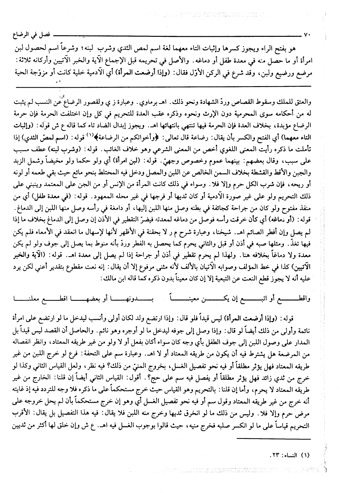 قَوْلُهُ: (لَبَنِ امْرَأَةٍ) أَيْ وَلَوْ حُكْمًا وَلَوْ مَخِيضًا وَشَمِلَ الزُّبْدَ وَالْجُبْنَ وَالْأَقِطَ وَالْقِشْطَةَ بِخِلَافِ السَّمْنِ الْخَالِصِ عَنْ اللَّبَنِ وَالْمَصْلِ وَدَخَلَ فِيهِ الْمُخْتَلِطُ بِنَحْوِ مَائِعٍ حَيْثُ بَقِيَ طَعْمُهُ أَوْ لَوْنُهُ أَوْ رِيحُهُ، فَإِنْ شُرِبَ الْكُلَّ حَرَّمَ وَإِلَّا فَلَا. وَسَوَاءٌ فِي ذَلِكَ كَانَتْ الْمَرْأَةُ مِنْ الْإِنْسِ أَوْ مِنْ الْجِنِّ عَلَى الْمُعْتَمَدِ وَيَنْبَنِي عَلَى ذَلِكَ التَّحْرِيمُ وَلَوْ عَلَى غَيْرِ صُورَةِ الْآدَمِيَّةِ أَوْ كَانَ ثَدْيُهَا أَوْ فَرْجُهَا فِي غَيْرِ مَحِلِّهِ الْمَعْهُودِ.