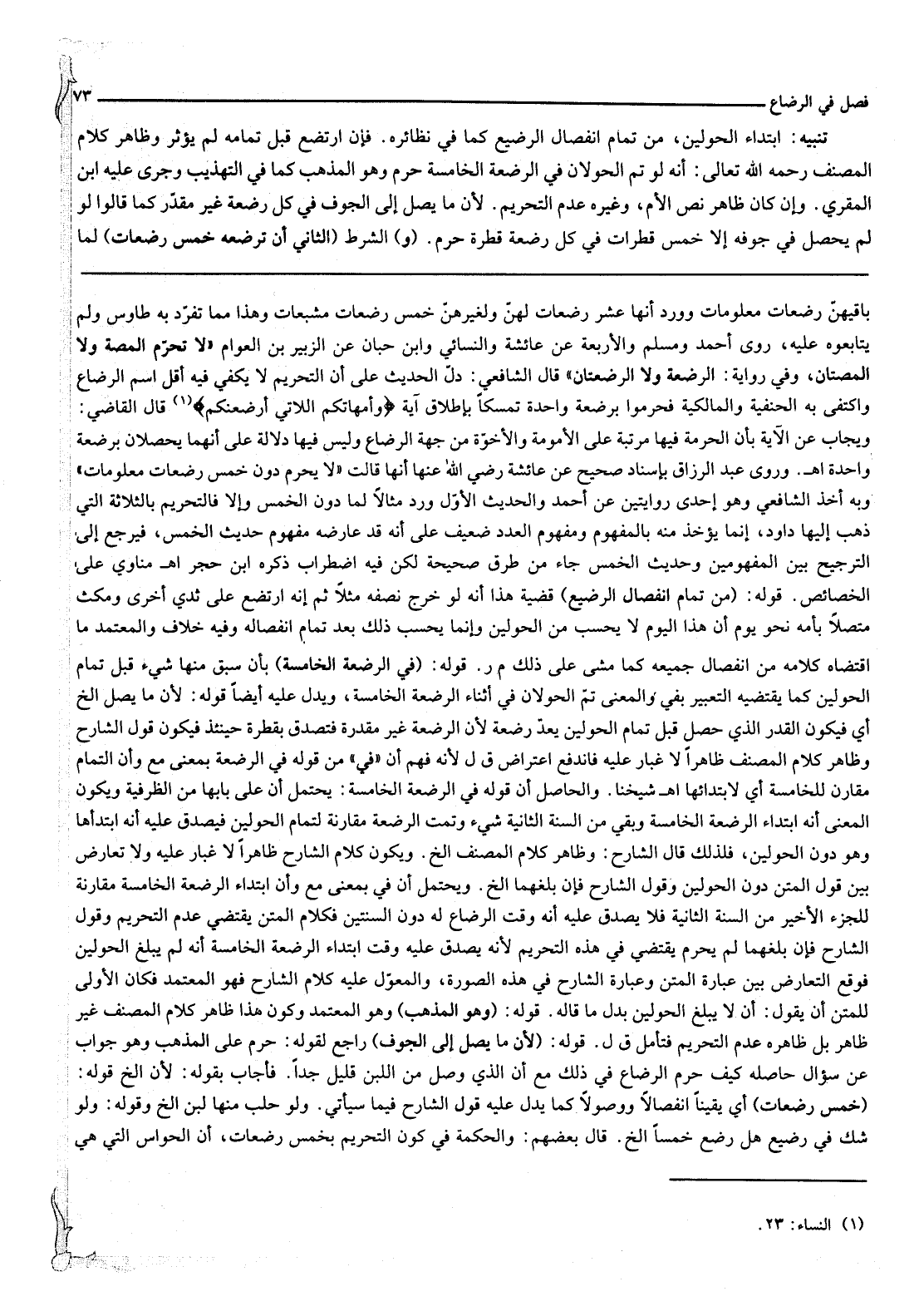 وَرَوَى عَبْدُ الرَّزَّاقِ بِإِسْنَادٍ صَحِيحٍ عَنْ عَائِشَةَ - رَضِيَ اللَّهُ عَنْهَا - أَنَّهَا قَالَتْ «لَا يُحَرِّمُ دُونَ خَمْسِ رَضَعَاتٍ مَعْلُومَاتٍ» وَبِهِ أَخَذَ الشَّافِعِيُّ وَهُوَ إحْدَى رِوَايَتَيْنِ عَنْ أَحْمَدَ وَالْحَدِيثُ الْأَوَّلُ وَرَدَ مِثَالًا لِمَا دُونَ الْخَمْسِ وَإِلَّا فَالتَّحْرِيمُ بِالثَّلَاثَةِ الَّتِي ذَهَبَ إلَيْهَا دَاوُد، إنَّمَا يُؤْخَذُ مِنْهُ بِالْمَفْهُومِ وَمَفْهُومُ الْعَدَدِ ضَعِيفٌ عَلَى أَنَّهُ قَدْ عَارَضَهُ مَفْهُومُ حَدِيثِ الْخَمْسِ، فَيَرْجِعُ إلَى التَّرْجِيحِ بَيْنَ الْمَفْهُومِينَ وَحَدِيثُ الْخَمْسِ جَاءَ مِنْ طُرُقٍ صَحِيحَةٍ لَكِنْ فِيهِ اضْطِرَابٌ ذَكَرَهُ ابْنُ حَجَرٍ. اهـ. مُنَاوِيٌّ عَلَى الْخَصَائِصِ. قَوْلُهُ: (مِنْ تَمَامِ انْفِصَالِ الرَّضِيعِ) قَضِيَّةُ هَذَا أَنَّهُ لَوْ خَرَجَ نِصْفُهُ مَثَلًا ثُمَّ إنَّهُ ارْتَضَعَ عَلَى ثَدْيِ أُخْرَى وَمَكَثَ مُتَّصِلًا بِأُمِّهِ نَحْوَ يَوْمٍ أَنَّ هَذَا الْيَوْمَ لَا يُحْسَبُ مِنْ الْحَوْلَيْنِ وَإِنَّمَا يُحْسَبُ ذَلِكَ بَعْدَ تَمَامِ انْفِصَالِهِ وَفِيهِ خِلَافٌ وَالْمُعْتَمَدُ مَا اقْتَضَاهُ كَلَامُهُ مِنْ انْفِصَالِ جَمِيعِهِ كَمَا مَشَى عَلَى ذَلِكَ م ر.