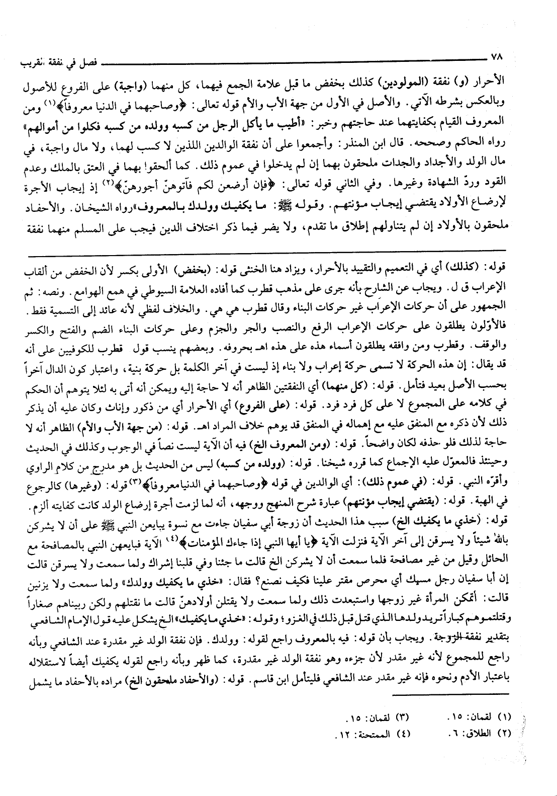 الْأَحْرَارِ (وَ) نَفَقَةُ (الْمَوْلُودِينَ) كَذَلِكَ بِخَفْضِ مَا قَبْلَ عَلَامَةِ الْجَمْعِ فِيهِمَا، كُلٌّ مِنْهُمَا (وَاجِبَةٌ) عَلَى الْفُرُوعِ لِلْأُصُولِ وَبِالْعَكْسِ بِشَرْطِهِ الْآتِي. وَالْأَصْلُ فِي الْأَوَّلِ مِنْ جِهَةِ الْأَبِ وَالْأُمِّ قَوْله تَعَالَى: {وَصَاحِبْهُمَا فِي الدُّنْيَا مَعْرُوفًا} [لقمان: 15] وَمِنْ الْمَعْرُوفِ الْقِيَامُ بِكِفَايَتِهِمَا عِنْدَ حَاجَتِهِمْ وَخَبَرُ: «أَطْيَبُ مَا يَأْكُلُ الرَّجُلُ مِنْ كَسْبِهِ وَوَلَدُهُ مِنْ كَسْبِهِ فَكُلُوا مِنْ أَمْوَالِهِمْ» رَوَاهُ الْحَاكِمُ وَصَحَّحَهُ. قَالَ ابْنُ الْمُنْذِرِ: وَأَجْمَعُوا عَلَى أَنَّ نَفَقَةَ الْوَالِدَيْنِ اللَّذَيْنِ لَا كَسْبَ لَهُمَا وَلَا مَالَ وَاجِبَةٌ فِي مَالِ الْوَلَدِ، وَالْأَجْدَادُ وَالْجَدَّاتُ مُلْحَقُونَ بِهِمَا إنْ لَمْ يَدْخُلُوا فِي عُمُومِ ذَلِكَ. كَمَا أُلْحِقُوا بِهِمَا فِي الْعِتْقِ بِالْمِلْكِ وَعَدَمِ الْقَوَدِ وَرَدِّ الشَّهَادَةِ وَغَيْرِهَا. وَفِي الثَّانِي قَوْله تَعَالَى: {فَإِنْ أَرْضَعْنَ لَكُمْ فَآتُوهُنَّ أُجُورَهُنَّ} [الطلاق: 6] إذْ إيجَابُ الْأُجْرَةِ لِإِرْضَاعِ الْأَوْلَادِ يَقْتَضِي إيجَابَ مُؤْنَتِهِمْ. وَقَوْلُهُ - صَلَّى اللَّهُ عَلَيْهِ وَسَلَّمَ -: «مَا يَكْفِيكِ وَوَلَدَكِ بِالْمَعْرُوفِ» رَوَاهُ الشَّيْخَانِ. وَالْأَحْفَادُ مُلْحَقُونَ بِالْأَوْلَادِ إنْ لَمْ يَتَنَاوَلْهُمْ إطْلَاقُ مَا تَقَدَّمَ، وَلَا يَضُرُّ فِيمَا ذُكِرَ اخْتِلَافُ الدِّينِ فَيَجِبُ عَلَى الْمُسْلِمِ مِنْهُمَا نَفَقَةُ