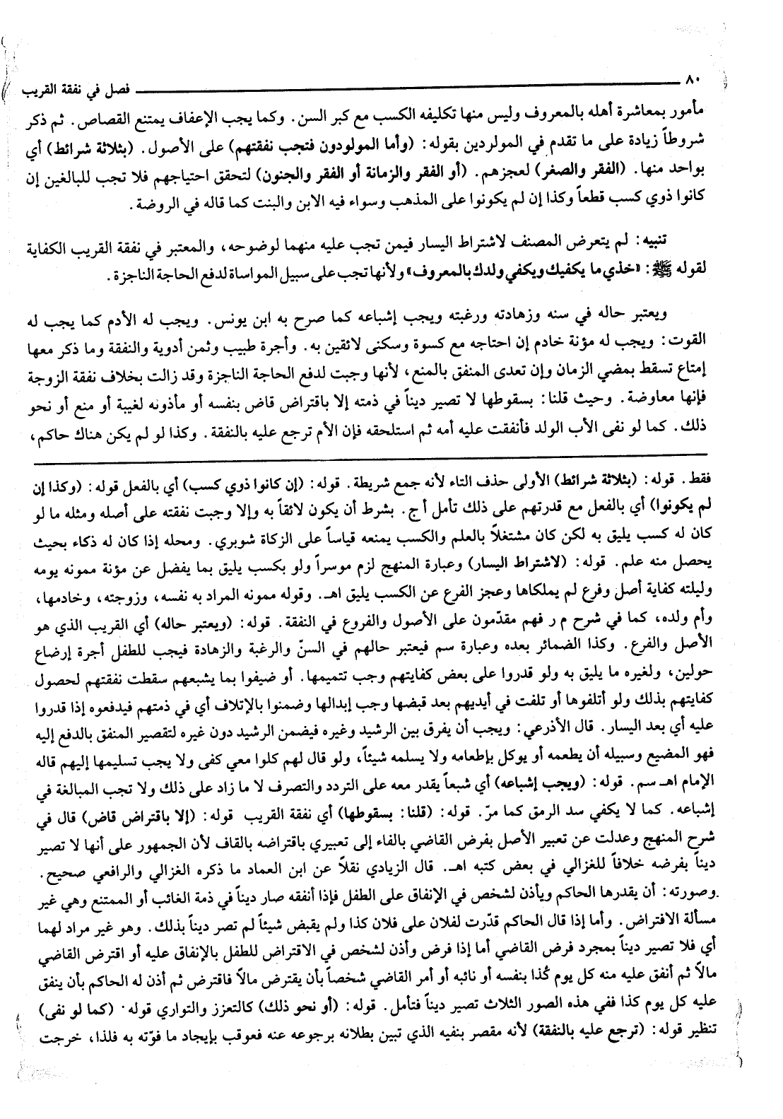ثُمَّ ذَكَرَ شُرُوطًا زِيَادَةً عَلَى مَا تَقَدَّمَ فِي الْمَوْلُودِينَ بِقَوْلِهِ: (وَأَمَّا الْمَوْلُودُونَ فَتَجِبُ نَفَقَتُهُمْ) عَلَى الْأُصُولِ. (بِثَلَاثَةِ شَرَائِطَ) أَيْ بِوَاحِدٍ مِنْهَا. (الْفَقْرُ وَالصِّغَرُ) لِعَجْزِهِمْ. (أَوْ الْفَقْرُ وَالزَّمَانَةُ أَوْ الْفَقْرُ وَالْجُنُونُ) لِتَحَقُّقِ احْتِيَاجِهِمْ فَلَا تَجِبُ لِلْبَالِغِينَ إنْ كَانُوا ذَوِي كَسْبٍ قَطْعًا وَكَذَا إنْ لَمْ يَكُونُوا عَلَى الْمَذْهَبِ وَسَوَاءٌ فِيهِ الِابْنُ وَالْبِنْتُ كَمَا قَالَهُ فِي الرَّوْضَةِ. تَنْبِيهٌ: لَمْ يَتَعَرَّضْ الْمُصَنِّفُ لِاشْتِرَاطِ الْيَسَارِ فِيمَنْ تَجِبُ عَلَيْهِ مِنْهُمَا لِوُضُوحِهِ، وَالْمُعْتَبَرُ فِي نَفَقَةِ الْقَرِيبِ الْكِفَايَةُ لِقَوْلِهِ - صَلَّى اللَّهُ عَلَيْهِ وَسَلَّمَ -: «خُذِي مَا يَكْفِيكِ وَيَكْفِي وَلَدَكَ بِالْمَعْرُوفِ» وَلِأَنَّهَا تَجِبُ عَلَى سَبِيلِ الْمُوَاسَاةِ لِدَفْعِ الْحَاجَةِ النَّاجِزَةِ.