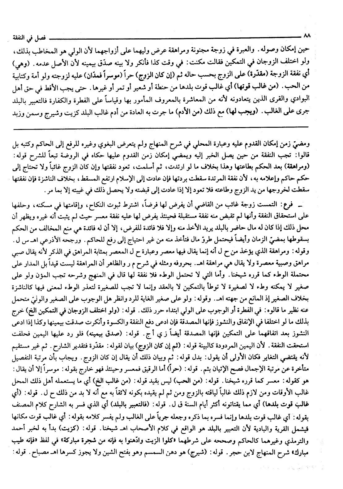 وَالْعِبْرَةُ فِي زَوْجَةٍ مَجْنُونَةٍ وَمُرَاهِقَةٍ عَرْضُ وَلِيِّهِمَا عَلَى أَزْوَاجِهِمَا لِأَنَّ الْوَلِيَّ هُوَ الْمُخَاطَبُ بِذَلِكَ، وَلَوْ اخْتَلَفَ الزَّوْجَانِ فِي التَّمْكِينِ فَقَالَتْ مَكَّنْت: فِي وَقْتِ كَذَا فَأَنْكَرَ وَلَا بَيِّنَةَ صُدِّقَ بِيَمِينِهِ لِأَنَّ الْأَصْلَ عَدَمُهُ. (وَهِيَ) أَيْ نَفَقَةُ الزَّوْجَةِ (مُقَدَّرَةٌ) عَلَى الزَّوْجِ بِحَسَبِ حَالِهِ ثُمَّ (إنْ كَانَ الزَّوْجُ) حُرًّا (مُوسِرًا فَمُدَّانِ) عَلَيْهِ لِزَوْجَتِهِ وَلَوْ أَمَةً وَكِتَابِيَّةً، مِنْ الْحَبِّ. (مِنْ غَالِبِ قُوتِهَا) أَيْ غَالِبِ قُوتِ بَلَدِهَا مِنْ حِنْطَةٍ أَوْ شَعِيرٍ أَوْ تَمْرٍ أَوْ غَيْرِهَا. حَتَّى يَجِبَ الْأَقِطُ فِي حَقِّ أَهْلِ الْبَوَادِي وَالْقُرَى الَّذِينَ يَعْتَادُونَهُ لِأَنَّهُ مِنْ الْمُعَاشَرَةِ بِالْمَعْرُوفِ الْمَأْمُورِ بِهَا وَقِيَاسًا عَلَى الْفِطْرَةِ وَالْكَفَّارَةِ فَالتَّعْبِيرُ بِالْبَلَدِ جَرَى عَلَى الْغَالِبِ.