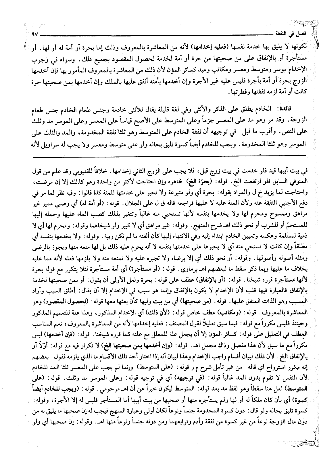 وَأَقْرَبُ مَا قِيلَ فِي تَوْجِيهِهِ أَنَّ نَفَقَةَ الْخَادِمِ عَلَى الْمُتَوَسِّطِ وَهُوَ ثُلُثَا نَفَقَةِ الْمَخْدُومَةِ، وَالْمُدُّ وَالثُّلُثُ عَلَى الْمُوسِرِ وَهُوَ ثُلُثَا الْمَخْدُومَةِ. وَيَجِبُ لِلْخَادِمِ أَيْضًا كِسْوَةٌ تَلِيقُ بِحَالِهِ وَلَوْ عَلَى مُتَوَسِّطٍ وَمُعْسِرٍ وَلَا يَجِبُ لَهُ سَرَاوِيلُ لِأَنَّهُ