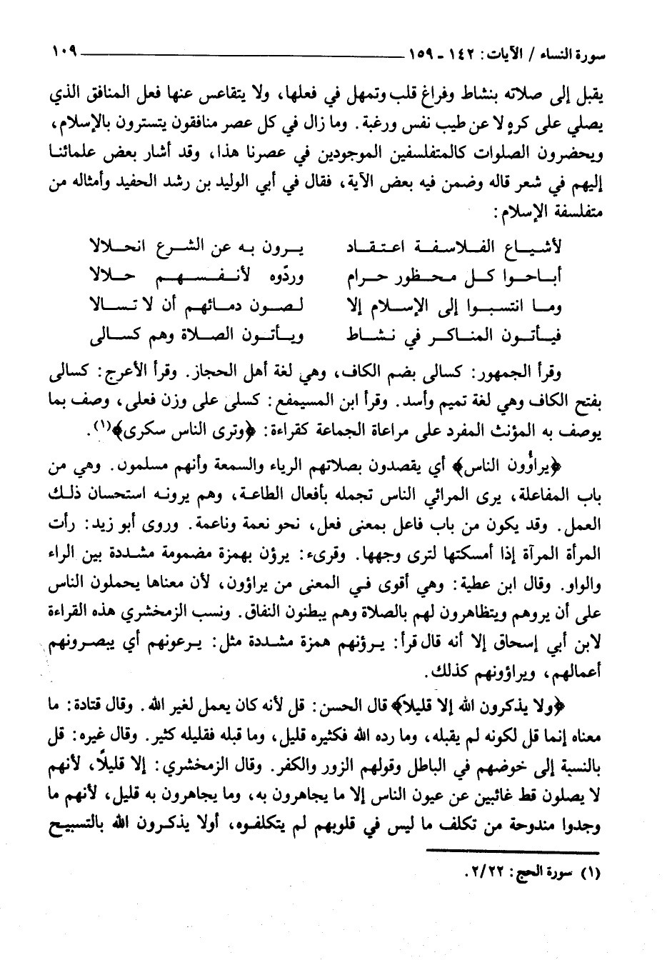 يُقْبِلَ إِلَى صَلَاتِهِ بِنَشَاطٍ وفراغ قَلْبٍ وَتَمَهُّلٍ فِي فِعْلِهَا، وَلَا يَتَقَاعَسُ عَنْهَا فِعْلَ الْمُنَافِقِ الَّذِي يُصَلِّي عَلَى كُرْهٍ لَا عَنْ طِيبِ نَفْسٍ وَرَغْبَةٍ. وَمَا زَالَ فِي كُلِّ عَصْرٍ مُنَافِقُونَ يَتَسَتَّرُونَ بِالْإِسْلَامِ، وَيَحْضُرُونَ الصَّلَوَاتِ كَالْمُتَفَلْسِفِينَ الْمَوْجُودِينَ فِي عَصْرِنَا هَذَا، وَقَدْ أَشَارَ بَعْضُ عُلَمَائِنَا إِلَيْهِمْ فِي شِعْرٍ قَالَهُ وَضَمَّنَ فِيهِ بَعْضَ الْآيَةِ، فَقَالَ فِي أَبِي الْوَلِيدِ بْنِ رُشْدٍ الْحَفِيدِ وَأَمْثَالِهِ مِنْ مُتَفَلْسِفَةِ الْإِسْلَامِ:
