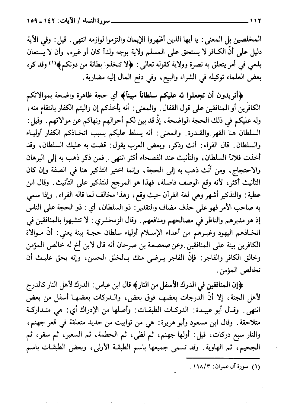 أَتُرِيدُونَ أَنْ تَجْعَلُوا لِلَّهِ عَلَيْكُمْ سُلْطاناً مُبِيناً أَيْ حُجَّةً ظَاهِرَةً وَاضِحَةً بِمُوَالَاتِكُمُ الْكَافِرِينَ أَوِ الْمُنَافِقِينَ عَلَى قَوْلِ الْقَفَّالِ. وَالْمَعْنَى: أَنَّهُ يَأْخُذُكُمْ إِنْ وَالَيْتُمُ الْكُفَّارَ بِانْتِقَامٍ مِنْهُ، وَلَهُ عَلَيْكُمْ فِي ذَلِكَ الْحُجَّةُ الْوَاضِحَةُ، إِذْ قَدْ بَيَّنَ لَكُمْ أَحْوَالَهُمْ وَنَهَاكُمْ عَنْ مُوَالَاتِهِمْ. وَقِيلَ: