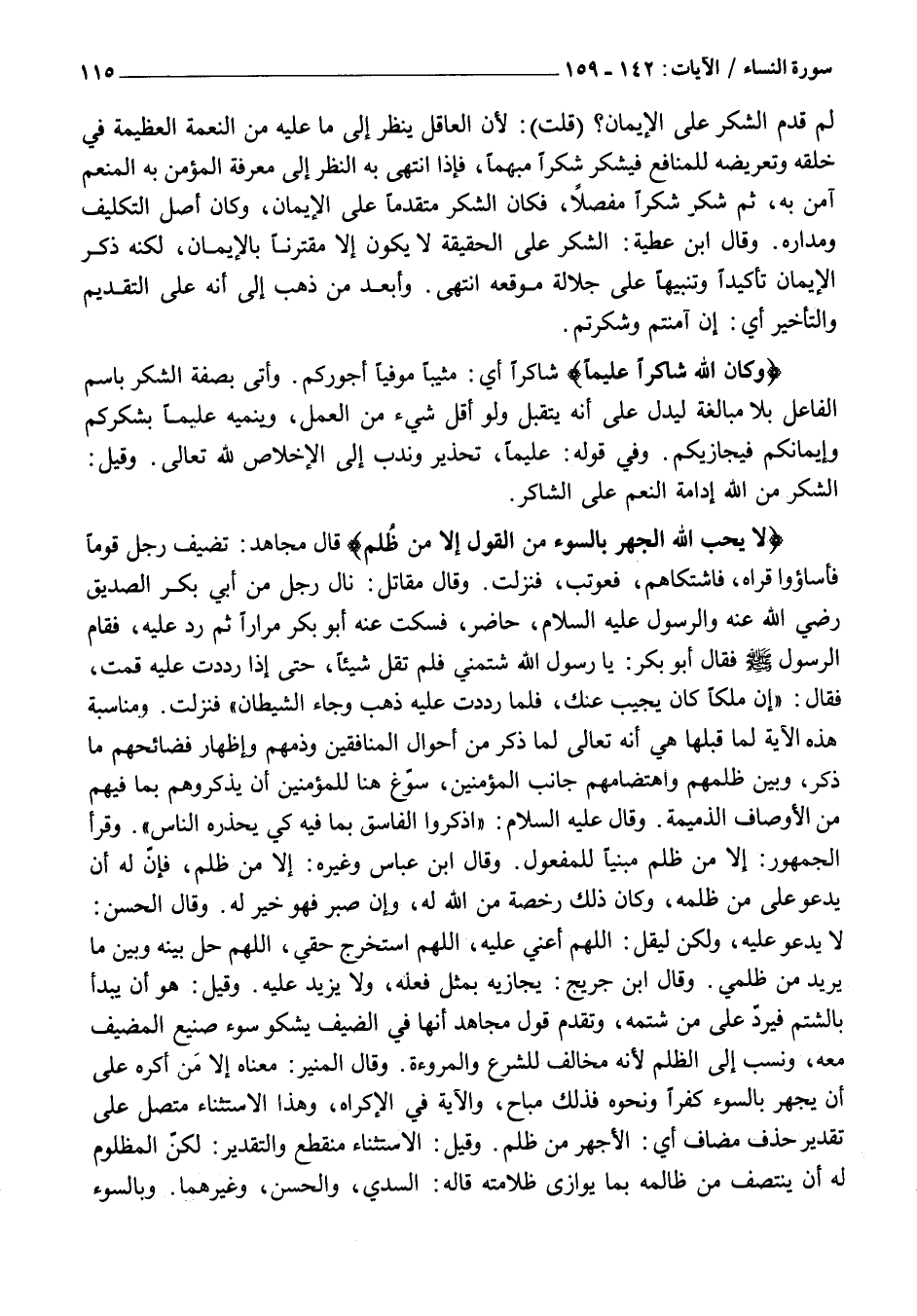 لَا يَدْعُو عَلَيْهِ، وَلَكِنْ لِيَقُلِ: اللَّهُمَّ أَعِنِّي عَلَيْهِ، اللَّهُمَّ اسْتَخْرِجْ حَقِّي، اللَّهُمَّ حُلْ بَيْنَهُ وَبَيْنَ مَا يُرِيدُ مِنْ ظُلْمِي. وَقَالَ ابْنُ جُرَيْجٍ: يُجَازِيهِ بِمِثْلِ فِعْلِهِ، وَلَا يَزِيدُ عَلَيْهِ. وَقِيلَ: هُوَ أَنْ يَبْدَأَ بِالشَّتْمِ فَيَرُدَّ عَلَى مَنْ شَتَمَهُ، وَتَقَدَّمَ قَوْلُ مُجَاهِدٍ أَنَّهَا فِي الضَّيْفِ يَشْكُو سُوءَ صَنِيعِ الْمُضِيفِ مَعَهُ، وَنُسِبَ إِلَى الظُّلْمِ لِأَنَّهُ مُخَالِفٌ لِلشَّرْعِ وَالْمُرُوءَةِ. وَقَالَ الْمُنِيرُ: مَعْنَاهُ إِلَّا مَنْ أُكْرِهَ عَلَى أَنْ يَجْهَرَ بِالسُّوءِ كُفْرًا وَنَحْوَهُ فَذَلِكَ مُبَاحٌ، وَالْآيَةُ فِي الْإِكْرَاهِ، وَهَذَا الِاسْتِثْنَاءُ مُتَّصِلٌ عَلَى تَقْدِيرِ حَذْفِ مُضَافٍ أي: الأجهر مَنْ ظُلِمَ. وَقِيلَ: الِاسْتِثْنَاءُ مُنْقَطِعٌ وَالتَّقْدِيرُ: لَكِنَّ الْمَظْلُومَ لَهُ أَنْ يَنْتَصِفَ مِنْ ظَالِمِهِ بِمَا يُوَازِي ظُلَامَتَهُ قَالَهُ: السُّدِّيُّ، وَالْحَسَنُ، وَغَيْرُهُمَا. وبالسوء