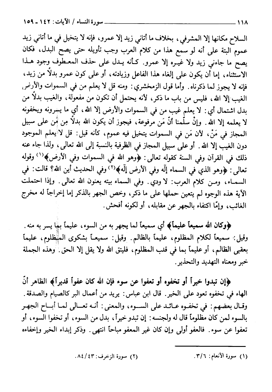إِنْ تُبْدُوا خَيْراً أَوْ تُخْفُوهُ أَوْ تَعْفُوا عَنْ سُوءٍ فَإِنَّ اللَّهَ كانَ عَفُوًّا قَدِيراً الظَّاهِرُ أَنَّ الْهَاءَ فِي تُخْفُوهُ تَعُودُ عَلَى الْخَيْرِ. قَالَ ابْنُ عَبَّاسٍ: يُرِيدُ من أعمال البر كَالصِّيَامِ وَالصَّدَقَةِ.