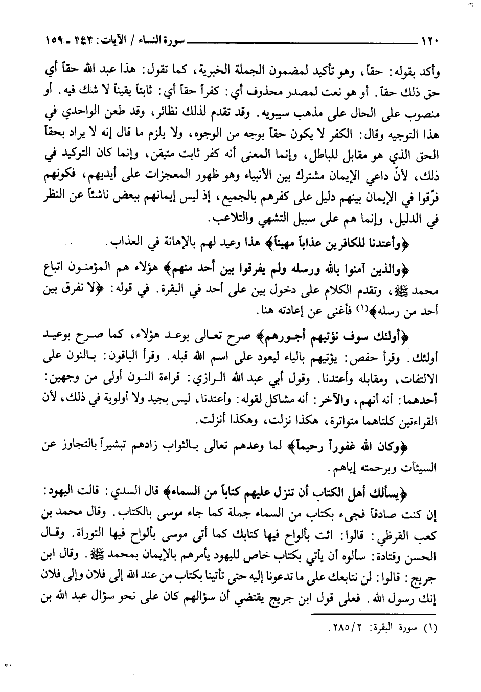 وَأَكَّدَ بِقَوْلِهِ: حَقًّا، وَهُوَ تَأْكِيدٌ لِمَضْمُونِ الْجُمْلَةِ الْخَبَرِيَّةِ، كَمَا تَقُولُ: هَذَا عَبْدُ اللَّهِ حَقًّا أَيْ حَقَّ ذَلِكَ حَقًّا. أَوْ هُوَ نَعْتٌ لِمَصْدَرٍ مَحْذُوفٍ أَيْ: كُفْرًا حَقًّا أَيْ: ثَابِتًا يَقِينًا لَا شَكَّ فِيهِ. أَوْ مَنْصُوبٍ عَلَى الْحَالِ عَلَى مَذْهَبِ سِيبَوَيْهِ. وَقَدْ تَقَدَّمَ لِذَلِكَ نَظَائِرُ، وَقَدْ طَعَنَ الْوَاحِدِيُّ فِي هَذَا التَّوْجِيهِ وَقَالَ: الْكُفْرُ لَا يَكُونُ حَقًّا بِوَجْهٍ مِنَ الْوُجُوهِ، وَلَا يَلْزَمُ مَا قَالَ إِنَّهُ لَا يُرَادُ بِحَقًّا الْحَقُّ الَّذِي هُوَ مُقَابِلٌ لِلْبَاطِلِ، وَإِنَّمَا الْمَعْنَى أَنَّهُ كُفْرٌ ثَابِتٌ مُتَيَقَّنٌ، وَإِنَّمَا كَانَ التَّوْكِيدُ فِي ذَلِكَ، لِأَنَّ دَاعِيَ الْإِيمَانِ مُشْتَرَكٌ بَيْنَ الْأَنْبِيَاءِ وَهُوَ ظُهُورُ الْمُعْجِزَاتِ عَلَى أَيْدِيهِمْ، فَكَوْنُهُمْ فَرَّقُوا فِي الْإِيمَانِ بَيْنَهُمْ دَلِيلٌ عَلَى كُفْرِهِمْ بِالْجَمِيعِ، إِذْ لَيْسَ إِيمَانُهُمْ بِبَعْضٍ نَاشِئًا عَنِ النَّظَرِ فِي الدَّلِيلِ، وَإِنَّمَا هُمْ عَلَى سَبِيلِ التَّشَهِّي وَالتَّلَاعُبِ.