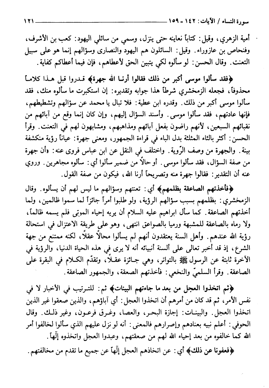 فَقَدْ سَأَلُوا مُوسى أَكْبَرَ مِنْ ذلِكَ فَقالُوا أَرِنَا اللَّهَ جَهْرَةً قَدَّرُوا قَبْلَ هَذَا كَلَامًا مَحْذُوفًا، فَجَعَلَهُ الزَّمَخْشَرِيُّ شَرْطًا هَذَا جَوَابُهُ وَتَقْدِيرُهُ: إِنِ اسْتَكْبَرْتَ مَا سَأَلُوهُ مِنْكَ، فَقَدْ سَأَلُوا مُوسَى أَكْبَرَ مِنْ ذَلِكَ. وَقَدَّرَهُ ابْنُ عَطِيَّةَ: فَلَا تُبَالِ يَا مُحَمَّدُ عَنْ سُؤَالِهِمْ وَتَشْطِيطِهِمْ، فَإِنَّهَا عَادَتُهُمْ، فَقَدْ سَأَلُوا مُوسَى. وَأَسْنَدَ السُّؤَالَ إِلَيْهِمْ، وَإِنْ كَانَ إِنَّمَا وَقَعَ مِنْ آبَائِهِمْ مِنْ نُقَبَائِهِمُ السَبْعِينَ، لِأَنَّهُمْ رَاضُونَ بِفِعْلِ آبَائِهِمْ وَمَذَاهِبِهِمْ، وَمُشَابِهُونَ لَهُمْ فِي التَّعَنُّتِ. وَقَرَأَ الْحَسَنُ: أَكْثَرَ بِالثَّاءِ الْمُثَلَّثَةِ بَدَلَ الْبَاءِ فِي قِرَاءَةِ الْجُمْهُورِ، وَمَعْنَى جَهْرَةً: عِيَانًا رُؤْيَةً مُنْكَشِفَةً بَيِّنَةً. وَالْجَهْرَةُ مِنْ وَصْفِ الرّوية. وَاخْتُلِفَ فِي النَّقْلِ عَنِ ابْنِ عَبَّاسٍ فَرُوِيَ عَنْهُ: «أَنَّ جَهْرَةً مِنْ صِفَةِ السُّؤَالِ، فَقَدْ سَأَلُوا مُوسَى. أَوْ حَالًا مِنْ ضَمِيرِ سَأَلُوا أَيْ: سَأَلُوهُ مُجَاهِرِينَ. وَرُوِيَ عَنْهُ أَنَّ التَّقْدِيرَ: فَقَالُوا جَهْرَةً مِنْهُ وَتَصْرِيحًا أَرِنَا اللَّهَ، فَيَكُونُ مِنْ صِفَةِ الْقَوْلِ.