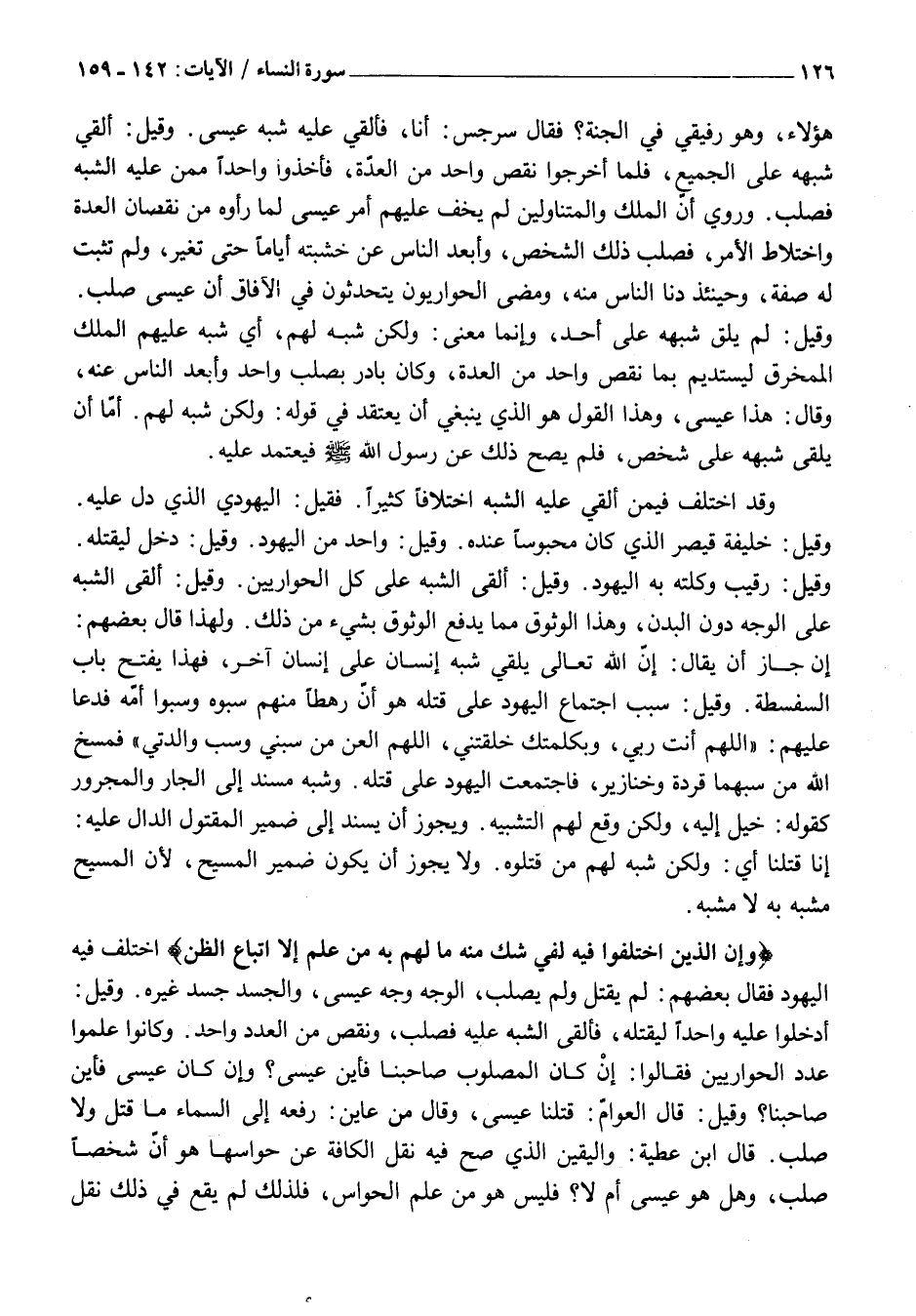 أَدْخَلُوا عَلَيْهِ وَاحِدًا لِيَقْتُلَهُ، فَأُلْقِيَ الشَّبَهُ عَلَيْهِ فَصُلِبَ، وَنَقَصَ مِنَ الْعَدَدِ وَاحِدٌ. وَكَانُوا عَلِمُوا عَدَدَ الْحَوَارِيِّينَ فَقَالُوا: إِنْ كَانَ الْمَصْلُوبُ صَاحِبَنَا فَأَيْنَ عِيسَى؟ وَإِنْ كَانَ عِيسَى فَأَيْنَ صَاحِبُنَا؟ وَقِيلَ: قَالَ الْعَوَامُّ: قَتَلْنَا عِيسَى، وَقَالَ مَنْ عَايَنَ: رَفَعَهُ إِلَى السَّمَاءِ مَا قُتِلَ وَلَا صُلِبَ. قَالَ ابْنُ عَطِيَّةَ: وَالْيَقِينُ الَّذِي صَحَّ فِيهِ نَقْلُ الْكَافَّةِ عَنْ حَوَاسِّهَا هو أنّ شخصا ب، وَهَلْ هُوَ عِيسَى أَمْ لَا؟ فَلَيْسَ هُوَ مِنْ عِلْمِ الْحَوَّاسِ، فَلِذَلِكَ لَمْ يَقَعْ فِي ذَلِكَ نَقْلٌ