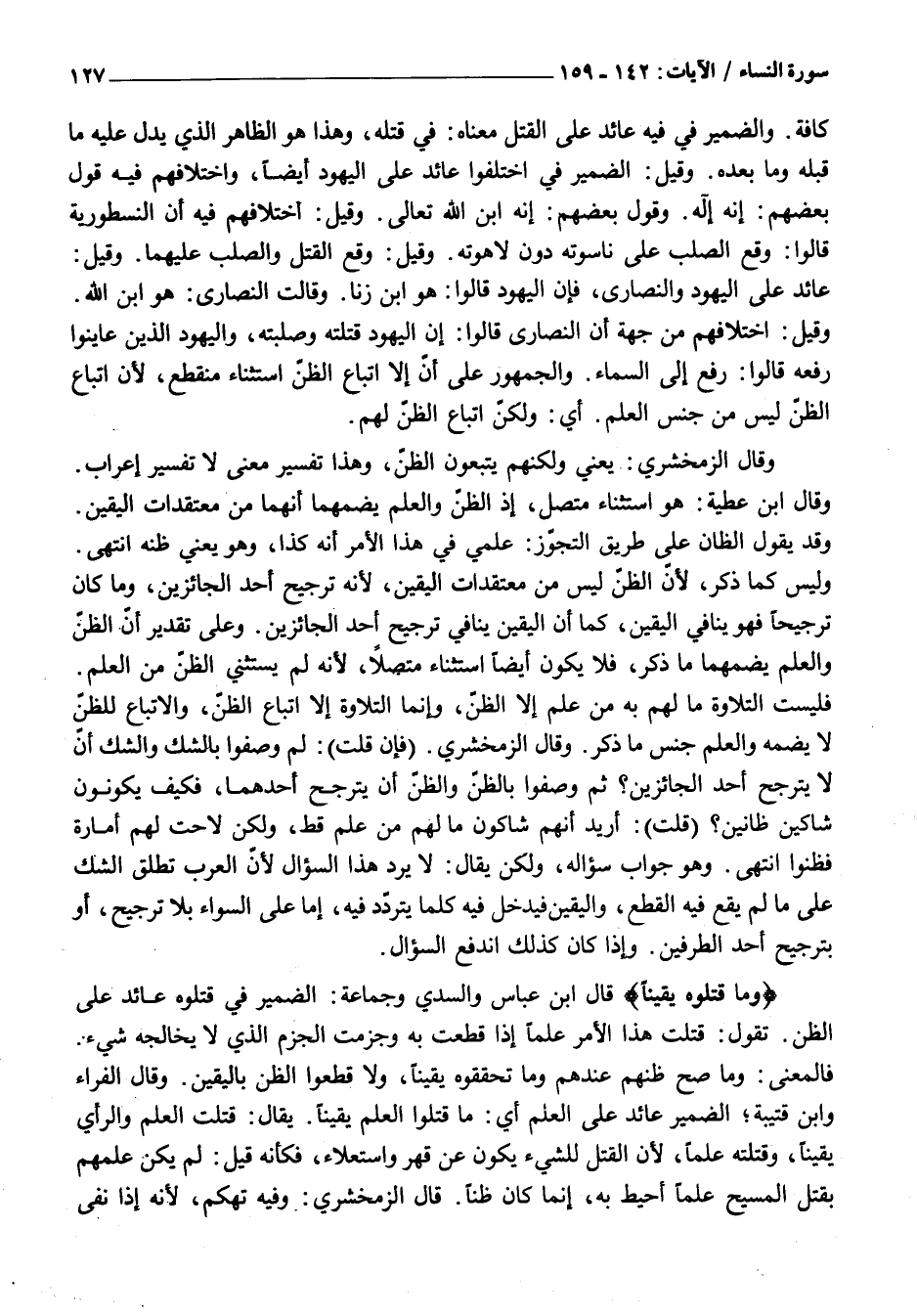 فَالْمَعْنَى: وَمَا صَحَّ ظَنُّهُمْ عِنْدَهُمْ وَمَا تَحَقَّقُوهُ يَقِينًا، وَلَا قَطَعُوا الظَّنَّ بِالْيَقِينِ. وَقَالَ الْفَرَّاءُ وَابْنُ قُتَيْبَةَ الضَّمِيرُ عَائِدٌ عَلَى الْعِلْمِ أَيْ: مَا قَتَلُوا الْعِلْمَ يَقِينًا. يُقَالُ: قَتَلْتُ الْعِلْمَ وَالرَّأْيَ يَقِينًا، وَقَتَلْتُهُ عِلْمًا، لِأَنَّ الْقَتْلَ لِلشَّيْءِ يَكُونُ عَنْ قَهْرٍ وَاسْتِعْلَاءٍ، فَكَأَنَّهُ قِيلَ: لَمْ يَكُنْ عِلْمُهُمْ بِقَتْلِ الْمَسِيحِ عِلْمًا أُحِيطَ بِهِ، إِنَّمَا كَانَ ظَنًّا. قَالَ الزَّمَخْشَرِيُّ: وَفِيهِ تَهَكُّمٌ، لأنه إِذَا نُفِيَ