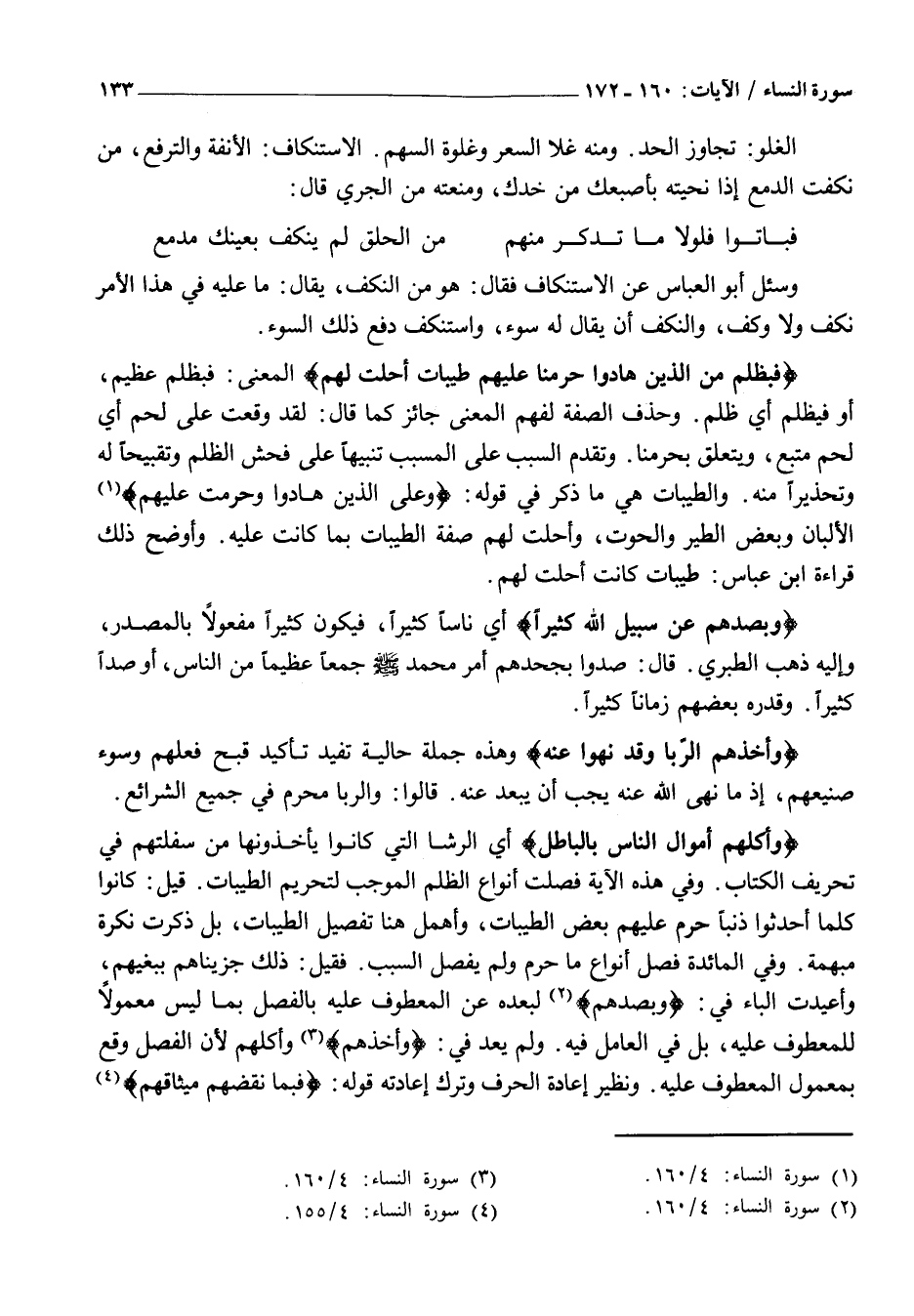 وَأَكْلِهِمْ أَمْوالَ النَّاسِ بِالْباطِلِ أَيِ الرُّشَا الَّتِي كَانُوا يَأْخُذُونَهَا مِنْ سِفْلَتِهِمْ فِي تَحْرِيفِ الْكِتَابِ. وَفِي هَذِهِ الْآيَةِ فُصِّلَتْ أَنْوَاعُ الظُّلْمِ الْمُوجِبِ لِتَحْرِيمِ الطَّيِّبَاتِ. قِيلَ: كَانُوا كُلَّمَا أَحْدَثُوا ذَنْبًا حُرِّمَ عَلَيْهِمْ بَعْضُ الطَّيِّبَاتِ، وَأُهْمِلَ هُنَا تَفْصِيلُ الطَّيِّبَاتِ، بَلْ ذُكِرَتْ نَكِرَةً مُبْهَمَةً. وَفِي الْمَائِدَةِ فَصَّلَ أَنْوَاعَ مَا حَرَّمَ وَلَمْ يُفَصِّلِ السَّبَبَ. فَقِيلَ: ذَلِكَ جَزَيْنَاهُمْ بِبَغْيِهِمْ، وَأُعِيدَتِ الْبَاءُ فِي: وَبِصَدِّهِمْ «2» لِبُعْدِهِ عَنِ الْمَعْطُوفِ عَلَيْهِ بِالْفَصْلِ بِمَا لَيْسَ مَعْمُولًا لِلْمَعْطُوفِ عَلَيْهِ، بَلْ فِي الْعَامِلِ فِيهِ. وَلَمْ يَعُدْ فِي: وَأَخْذِهِمُ «3» وَأَكْلِهِمْ لِأَنَّ الْفَصْلَ وَقَعَ بِمَعْمُولِ الْمَعْطُوفِ عَلَيْهِ. وَنَظِيرُ إِعَادَةِ الْحَرْفِ وَتَرْكِ إِعَادَتِهِ قَوْلُهُ: فَبِما نَقْضِهِمْ مِيثاقَهُمْ «4»