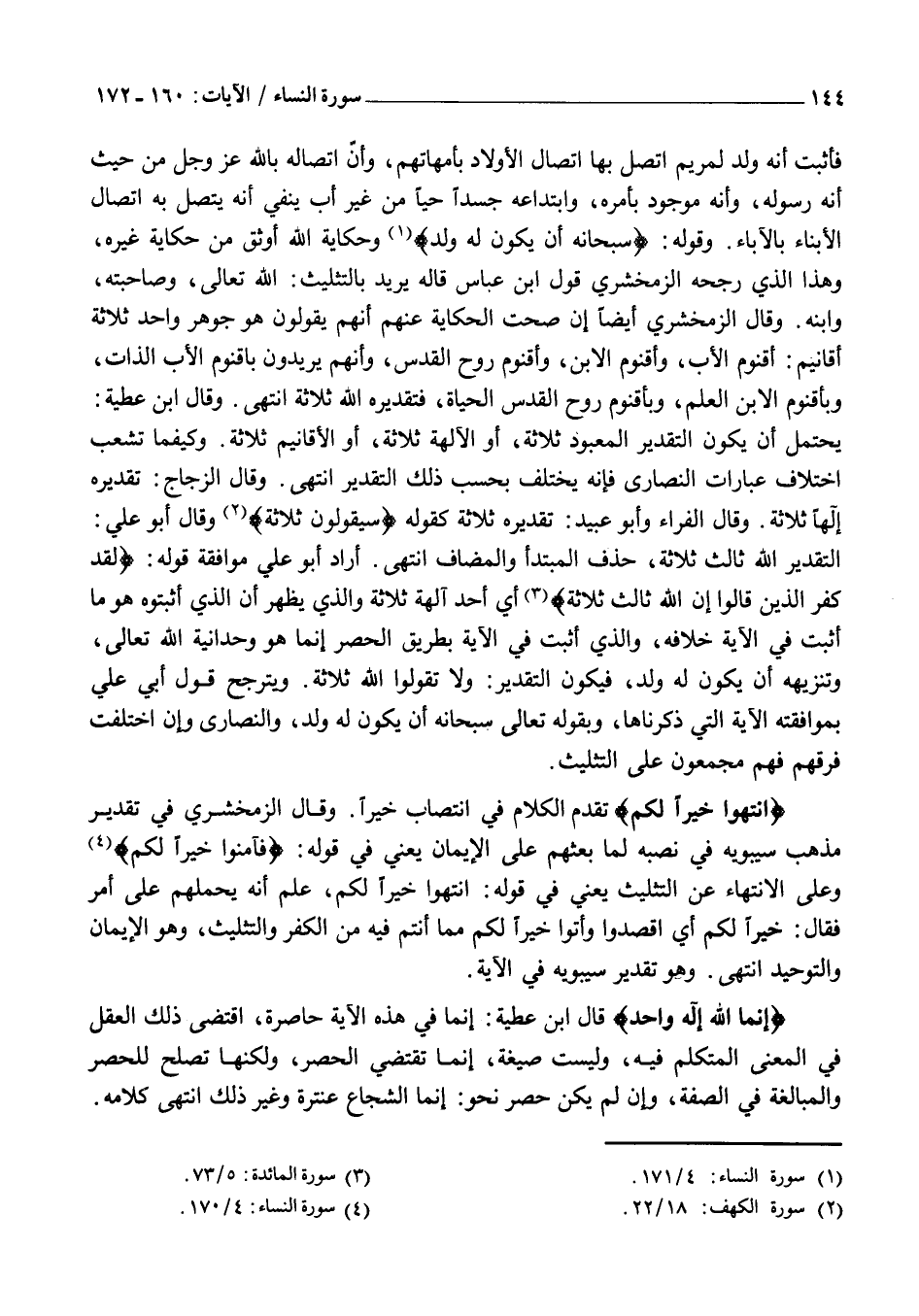 فَأَثْبَتَ أَنَّهُ وَلَدٌ لِمَرْيَمَ اتَّصَلَ بِهَا اتِّصَالَ الْأَوْلَادِ بِأُمَّهَاتِهِمْ، وَأَنَّ اتِّصَالَهُ بِاللَّهِ عَزَّ وَجَلَّ مِنْ حَيْثُ إِنَّهُ رَسُولُهُ، وَإِنَّهُ مَوْجُودٌ بِأَمْرِهِ، وَابْتِدَاعُهُ جَسَدًا حَيًّا مِنْ غَيْرِ أَبٍ يَنْفِي أَنَّهُ يَتَّصِلُ بِهِ اتِّصَالَ الْأَبْنَاءِ بِالْآبَاءِ. وَقَوْلُهُ: سُبْحانَهُ أَنْ يَكُونَ لَهُ وَلَدٌ «1» وَحِكَايَةُ اللَّهِ أَوْثَقُ مِنْ حِكَايَةِ غَيْرِهِ، وَهَذَا الَّذِي رَجَّحَهُ الزَّمَخْشَرِيُّ قَوْلُ ابْنِ عَبَّاسٍ قَالَهُ يُرِيدُ بِالتَّثْلِيثِ: اللَّهَ تَعَالَى، وَصَاحِبَتَهُ، وَابْنَهُ. وَقَالَ الزَّمَخْشَرِيُّ أَيْضًا إِنْ صَحَّتِ الْحِكَايَةُ عَنْهُمْ أَنَّهُمْ يَقُولُونَ هُوَ جَوْهَرٌ وَاحِدٌ ثَلَاثَةُ أَقَانِيمَ: أُقْنُومُ الْأَبِ، وَأُقْنُومُ الِابْنِ، وَأُقْنُومُ رُوحِ الْقُدُسِ، وَأَنَّهُمْ يُرِيدُونَ بِأُقْنُومِ الْأَبِ الذَّاتَ، وَبِأُقْنُومِ الِابْنِ الْعِلْمَ، وَبِأُقْنُومِ رُوحِ الْقُدُسِ الْحَيَاةَ، فَتَقْدِيرُهُ اللَّهُ ثَلَاثَةٌ انْتَهَى. وَقَالَ ابْنُ عَطِيَّةَ: