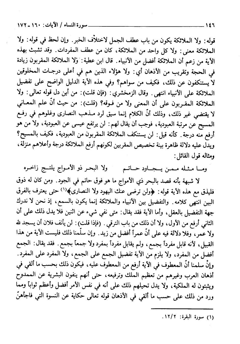 لَا شُبْهَةَ بِأَنَّهُ قَصَدَ بِالْبَحْرِ ذِي الْأَمْوَاجِ مَا هُوَ فَوْقَ حَاتِمٍ فِي الْجُودِ. وَمَنْ كَانَ لَهُ ذَوْقٌ فَلْيَذُقْ مَعَ هَذِهِ الْآيَةِ قَوْلَهُ: وَلَنْ تَرْضى عَنْكَ الْيَهُودُ وَلَا النَّصارى «1» حَتَّى يَعْتَرِفَ بِالْفَرْقِ الْبَيِّنِ انْتَهَى كَلَامُهُ. وَالتَّفْضِيلُ بَيْنَ الْأَنْبِيَاءِ وَالْمَلَائِكَةِ إِنَّمَا يَكُونُ بِالسَّمْعِ، إِذْ نَحْنُ لَا نُدْرِكُ جِهَةَ التَّفْضِيلِ بِالْعَقْلِ، وَأَمَّا الْآيَةُ فَقَدْ يُقَالُ: مَتَى نُفِيَ شَيْءٌ عَنِ اثْنَيْنِ فَلَا يَدُلُّ ذَلِكَ عَلَى أَنَّ الثَّانِيَ أَرْفَعُ مِنَ الْأَوَّلِ، وَلَا أَنَّ ذَلِكَ مِنْ بَابِ التَّرَقِّي. (فَإِذَا قُلْتَ) : لَنْ يَأْنَفَ فُلَانٌ أَنْ يَسْجُدَ لله ولا عمر، وفلا دَلَالَةَ فِيهِ عَلَى أَنَّ عَمْرًا أَفْضَلُ مِنْ زَيْدٍ. وَإِنْ سَلَّمْنَا ذَلِكَ فَلَيْسَتِ الْآيَةُ مِنْ هَذَا الْقَبِيلِ، لِأَنَّهُ قَابَلَ مُفْرَدًا بِجَمْعٍ، وَلَمْ يُقَابِلْ مُفْرَدًا بِمُفْرَدٍ وَلَا جَمْعًا بِجَمْعٍ. فَقَدْ يُقَالُ: الْجَمْعُ أَفْضَلُ مِنَ الْمُفْرَدِ، وَلَا يَلْزَمُ مِنَ الْآيَةِ تَفْضِيلُ الْجَمْعِ عَلَى الْجَمْعِ، وَلَا الْمُفْرَدُ عَلَى الْمُفْرَدِ.